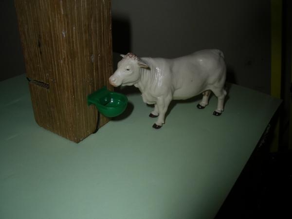 2 abreuvoirs a niveaux constants avec fil imitation tuyau .le support en bois est la vache ne fait pas parti de la vente.possible dans faire plus sur demande.