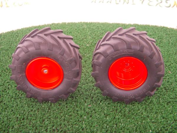 2 jantes aluminium arrière (rouge) + 2 pneus Michelin 1050. Pour FENDT 724 Schuco. 61.6 mm X 32.8 mm. Diamètre axe de roue 3mm.
