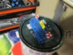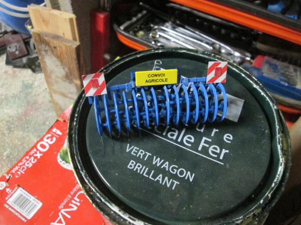 large = 9 cm ,peut-être recoupé en supprimant des disques , avec panneau convoi agricole et de sécurité en attelage en 3 points , les disques ne tournent pas , le bleu de l'attelage est un peu plus foncé que les disques car plus de peinture