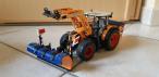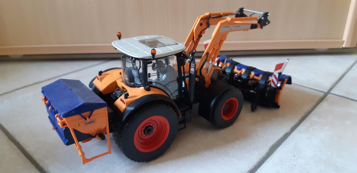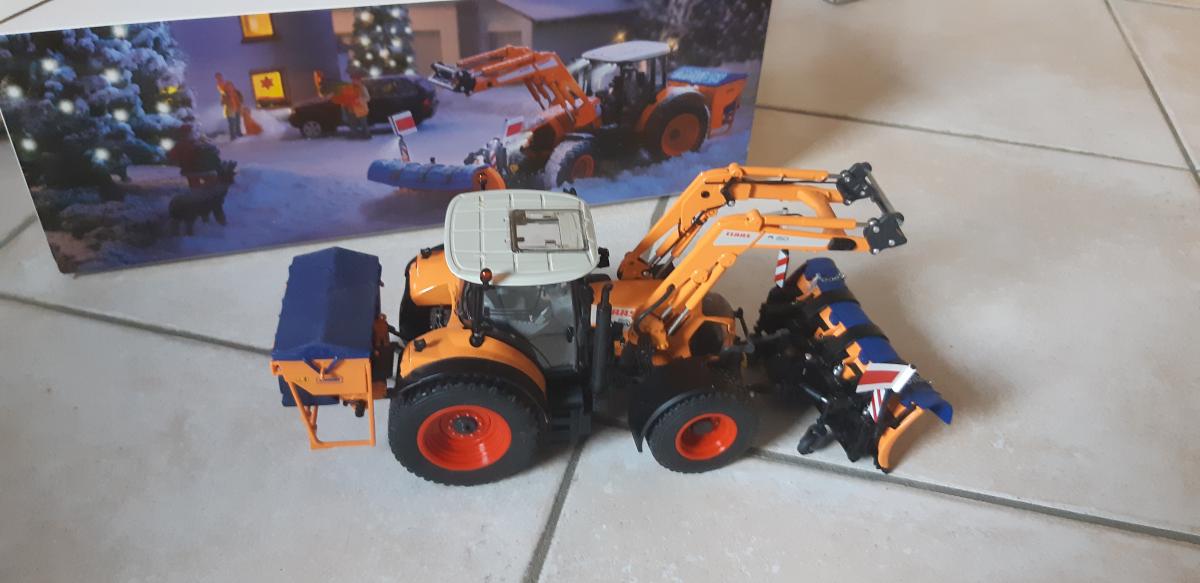 Coffret avec : un tracteur claas Arion 640 avec chargeur (démontable) une lame , une saleuse, une masse et un godet.