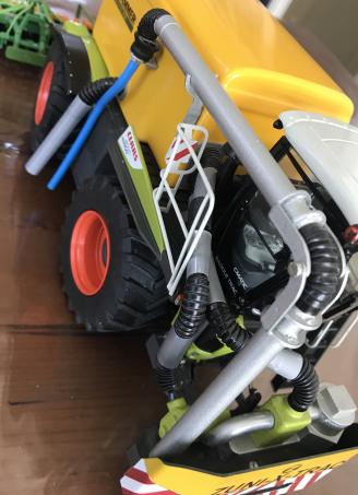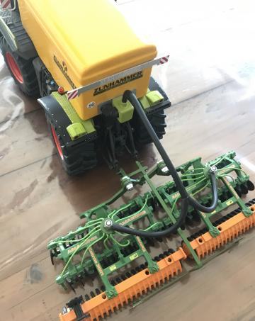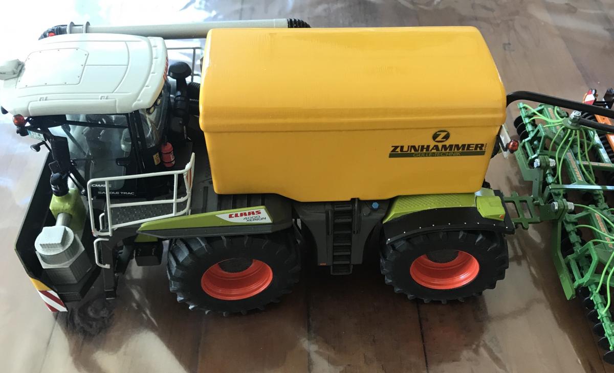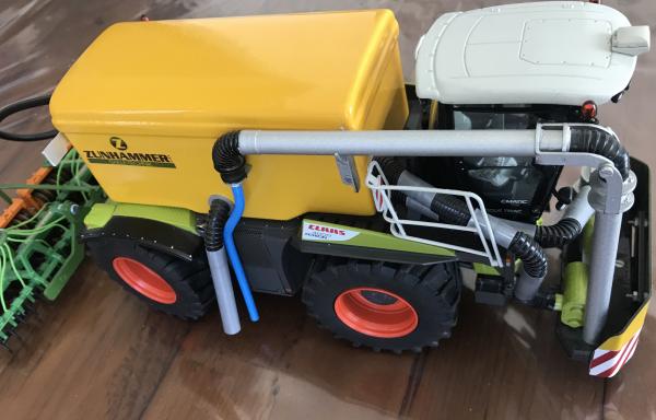 Xerion 4000 Saddle Trac de chez Weise Toys équipé d%u2019une cuve Zunhammer artisanal et d%u2019un épandeur Amazone modifiée