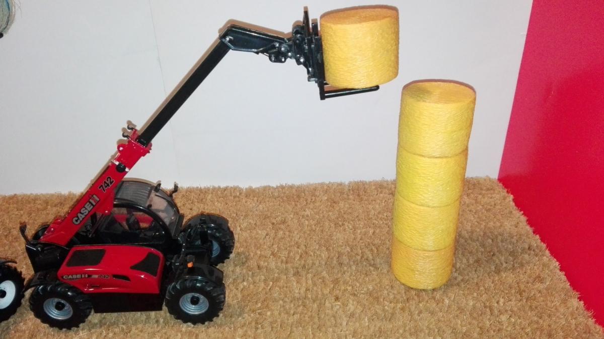 -Flèche télescopique avec une hauteur de levage appréciable et supportant des charges importantes (1 balle ronde de paille réplicagri ou 1 balles ronde de foin) en position levée grâce aux 2 vérins bien calibrés.