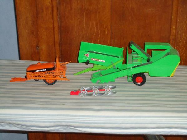 arracheuse à pomme de terre siku + pulvé britains + charrue 3 soc rouge britains