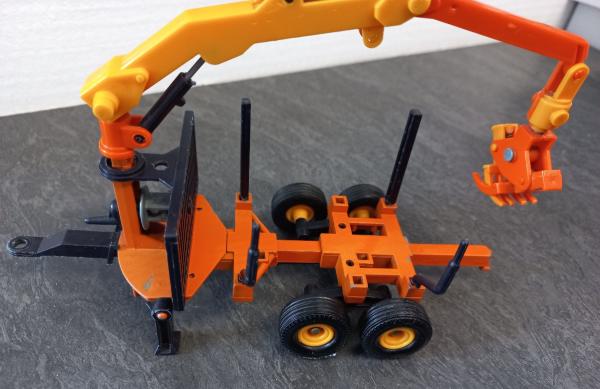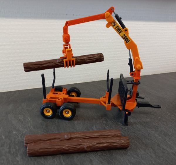 Ancien modèle de Remorque forestière FMV 2000 britains 1/32 avec 3 troncs d arbres....la peinture est un peu décolorés et quelques éclats de peinture (voir photo)