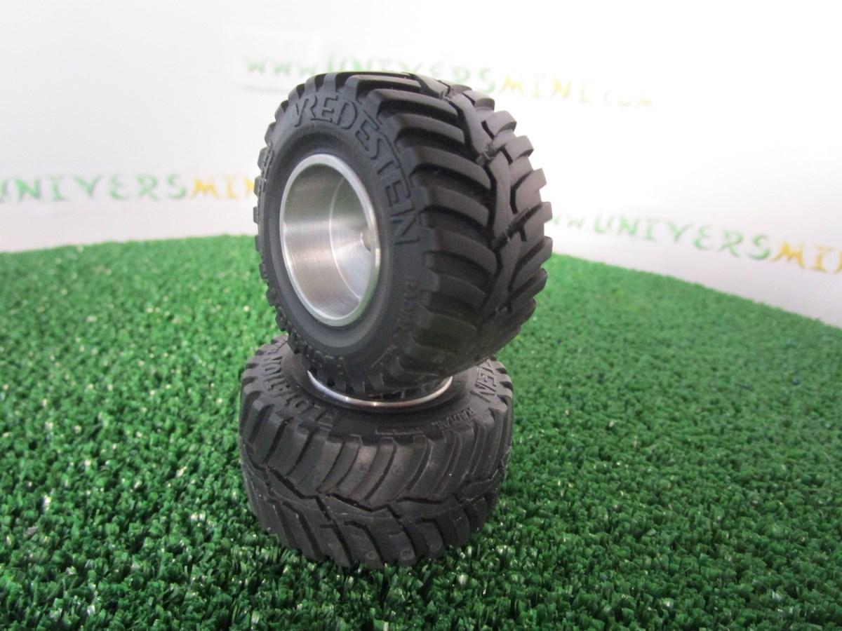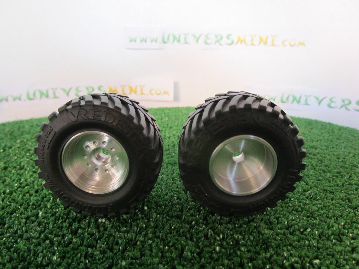 2 jantes aluminium + 2 pneus Vredestein Flotation. Diamètre 47 mm. Largeur 25.8 mm. S'adaptent sur les châssis Ros.