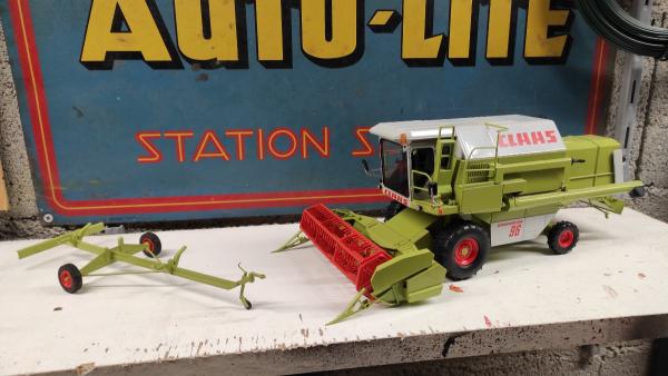 Moissonneuse batteuse CLAAS Dominator 96 Norev 1/32 avec chariot porte coupe.