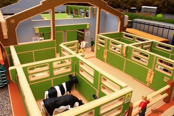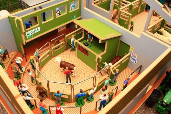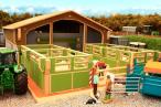 Marché aux bestiaux composé d'un quai de déchargement avec 4 box, 2 portes coulissantes pour faire entrer et sortir les animaux, une salle de vente avec tribune, bureau et café. Vendu sans les personnage, les animaux et les matériels. Longueur 760mm. Largeur 420mm. Hauteur 225mm. A monter.