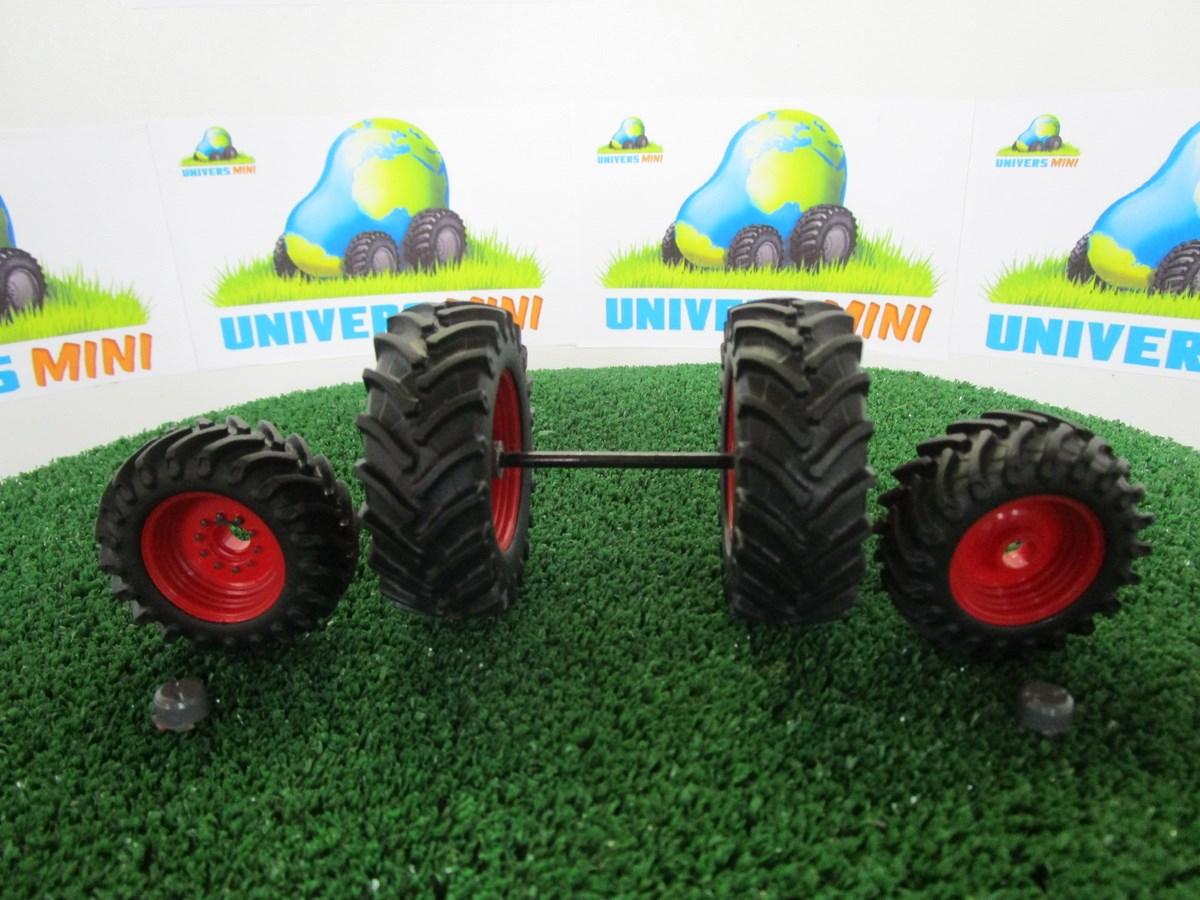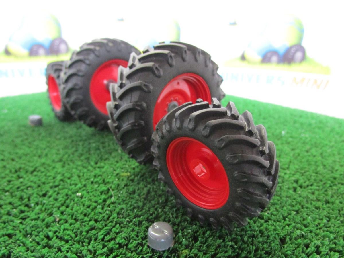 4 pneus (2 arrière et 2 avant) + jantes pour tracteur FENDT 828 Universal Hobbies. Référence fabricant 2652. Roue arrière : diamètre : 59mm. largeur : 20.5mm. Roue avant : diamètre : 43.5mm. largeur : 17mm.