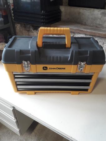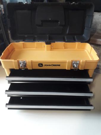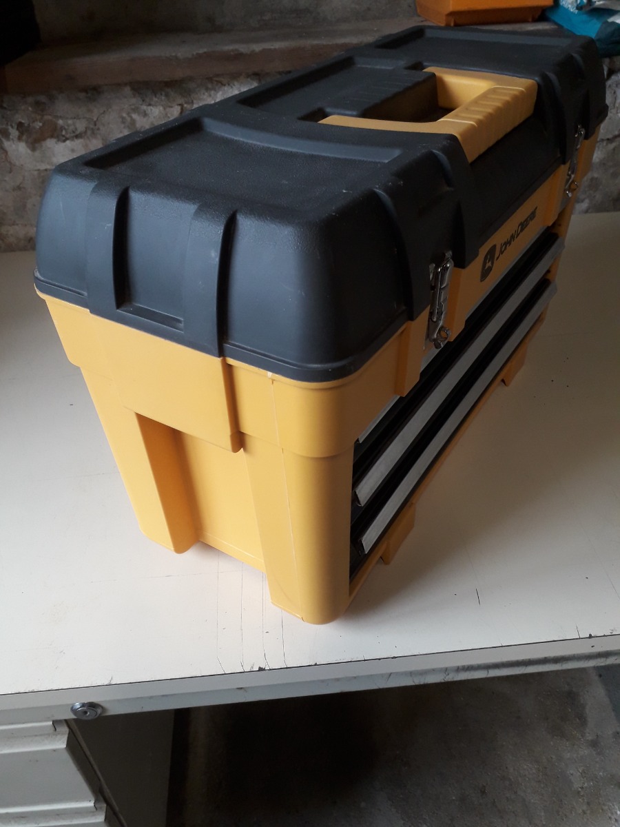 Malette de rangement JOHN DEERE 27x58cm hauteur 34cm d un poids de 8kg. Comporte une poignée de transport centrale + une de chaque côté. Couvercle supérieur ouvrant 21x56cm. Verrouillage par 2 loquets sur lesquels on peut mettre un cadenas. 3 tiroirs métallique coulissants 19x45cm hauteur 6cm. Ces derniers ne s ouvrent pas si le couvercle est fermé.