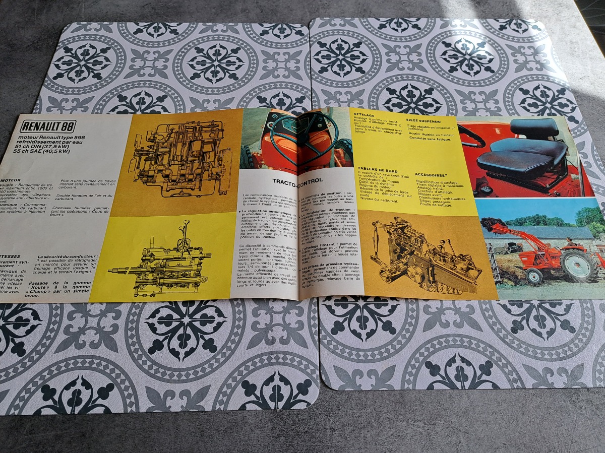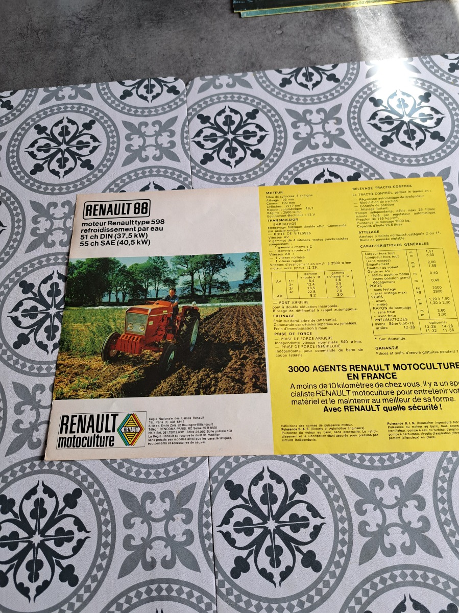 Prospectus tracteur RENAULT 88, deux feuilles recto verso en bon état voir les photos.