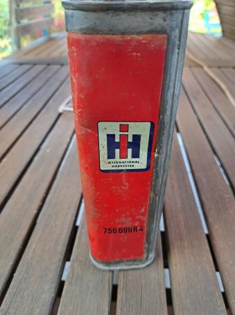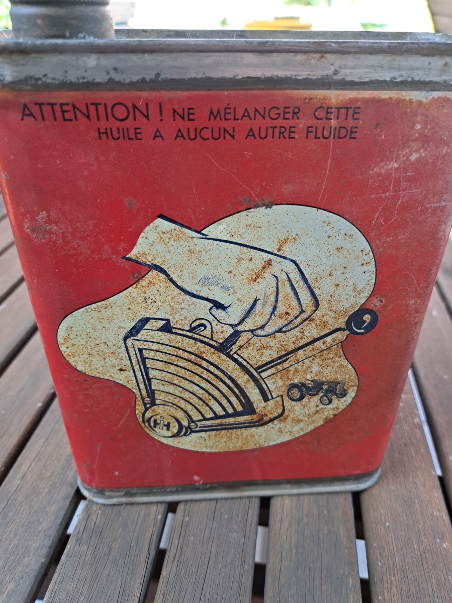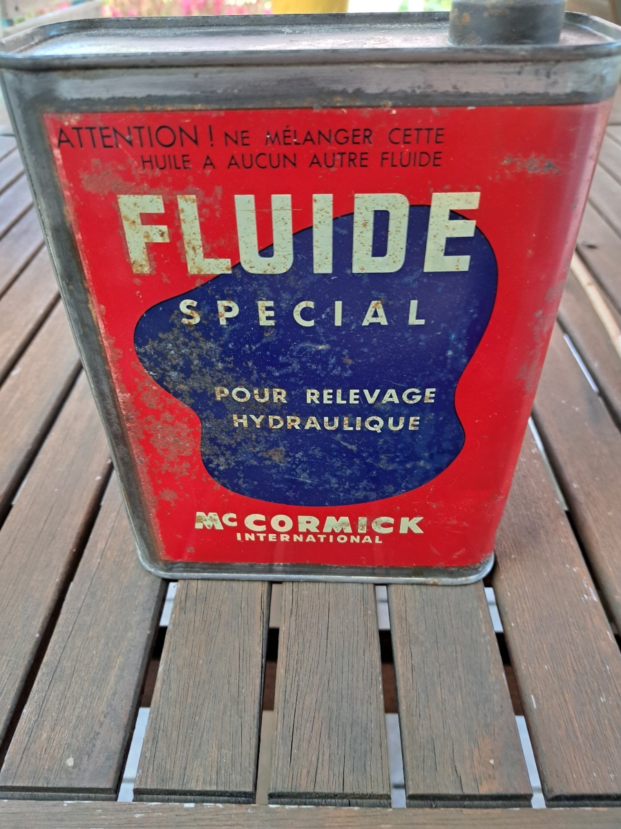 Bidon huile vide pour collectionneur. Description : huile fluide spéciale pour relevaient hydraulique McCormick International,une petite bosse sur le côté mais rien de méchant, bon état voir les photos.