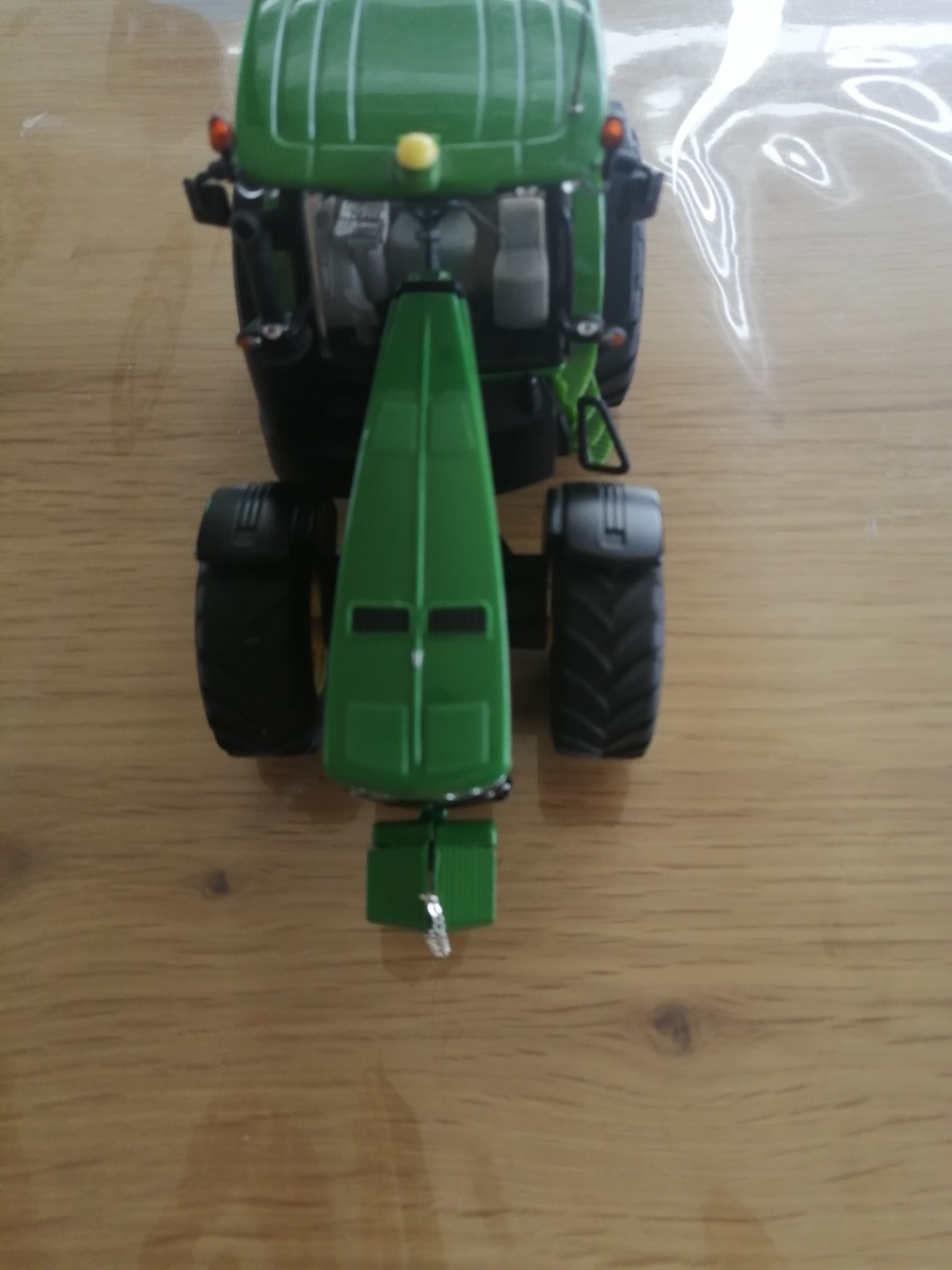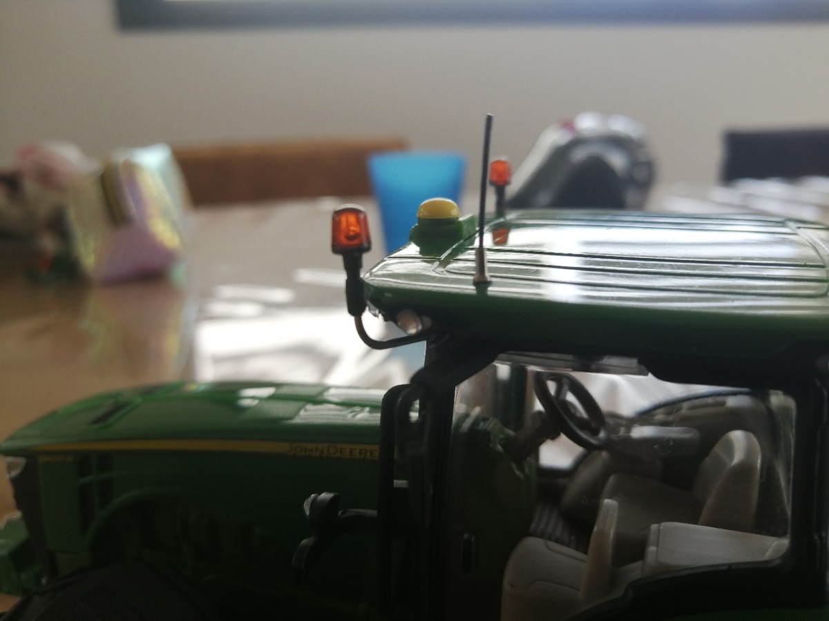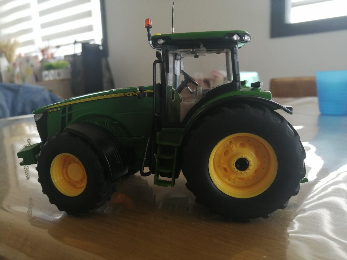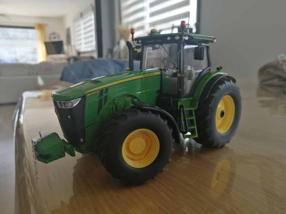 JOHN DEERE 8360r modifié, capot du 8400r, phares en diamant et changement de tous les feux de travail par des strass. J'ai enlevé le relevage avant puis changé par la masse du JOHN DEERE 7930 (le Siku peut être replacé car j'ai collé la masse à la colle chaude exprès pour pouvoir changer si besoin est) . Ajout d'une chaîne à la masse. Percage du pot d'échappement, peinture des rivets de roues, ajout de gyrophares et d'une antenne. Pour finir, collage de miroirs au niveau des rétros. Je fournis le relevage Siku avec.