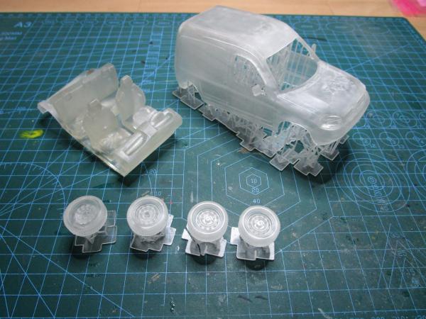 (supprimer les petits arbres de l'impression, poncer la carrosserie et l'intérieur, peinture ...)