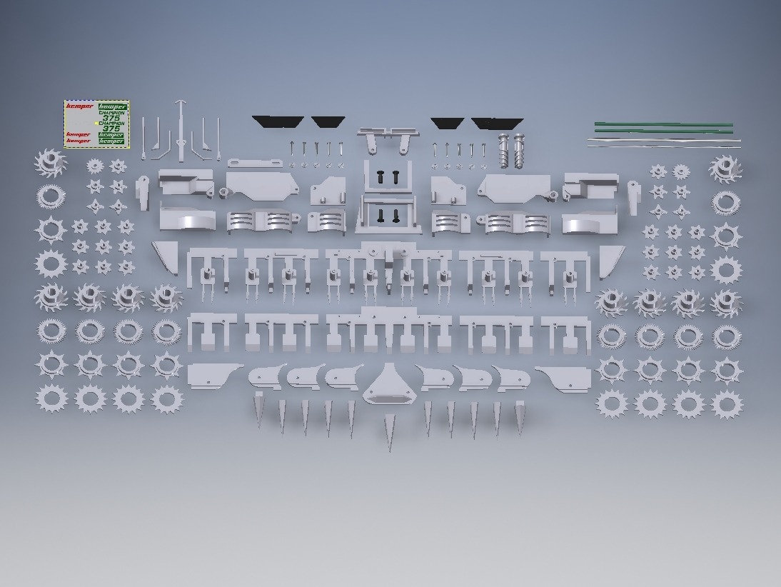 Kit Kemper Champion 375 en impression 3D. Kit à monter sois même, permet de construire un bec rouge ou jaune. 163 pièces, stickers compris (Notice d'assemblage en ligne ici : http://www.espace-machines-agri.be/pages/kits-1-32eme/notices-de-montage-kits-1-32/notice-kemper-champion-375.html