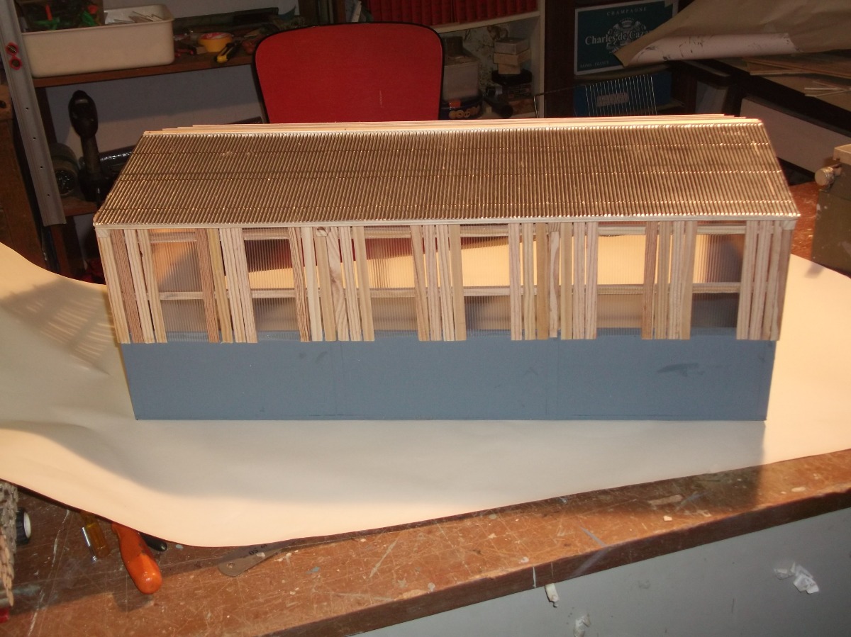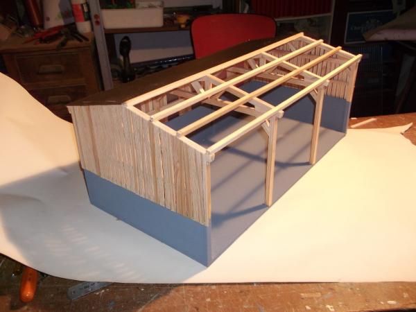 hangar 3 travée en bois avec sont bardage échelle 1/32 fabrication artisanal long 60 large 30 haut 24
