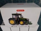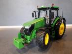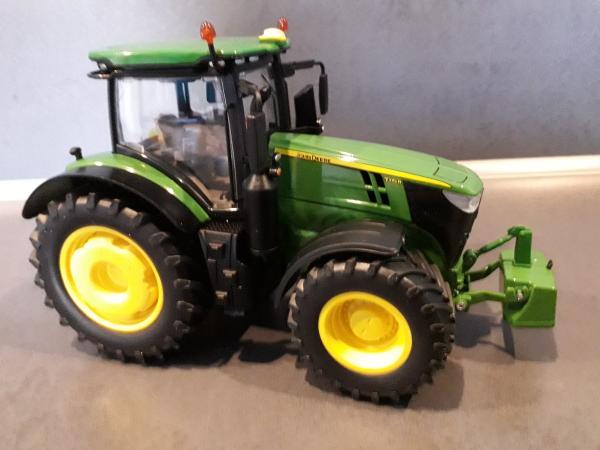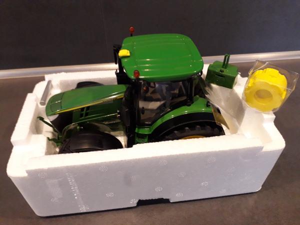 Tracteur JOHN DEERE 7310R en boîte. Avec une masse monobloc et deux masses de roues Ar. Exposé en vitrine.