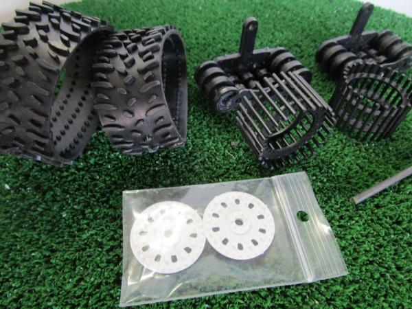 Train de chenille arrière n°3 (grande puissance, 180-300ch.) Adaptable sur un très grand nombre de tracteurs à l'échelle 1/32 (Wiking, Universal Hobbies, Schuco). Vendu avec voile/cache moyeu blanc.