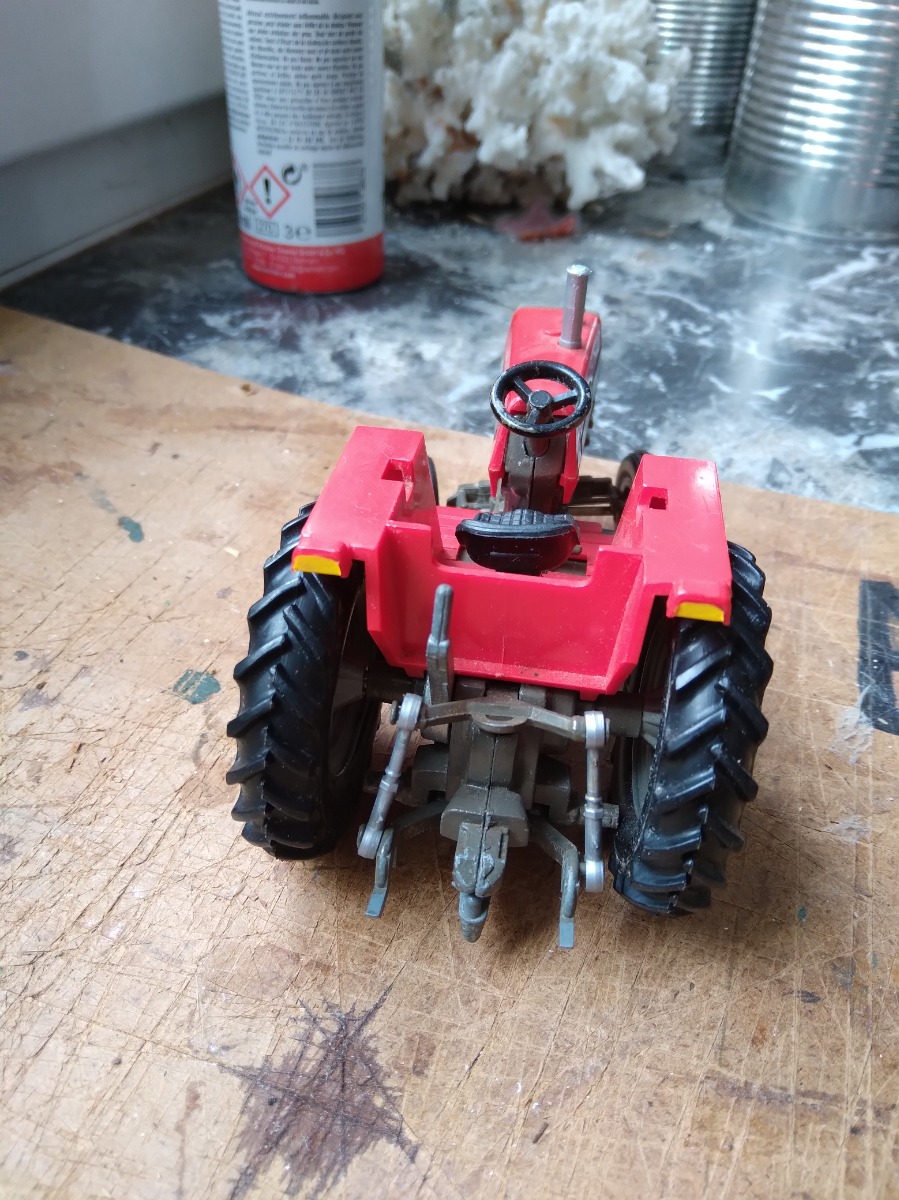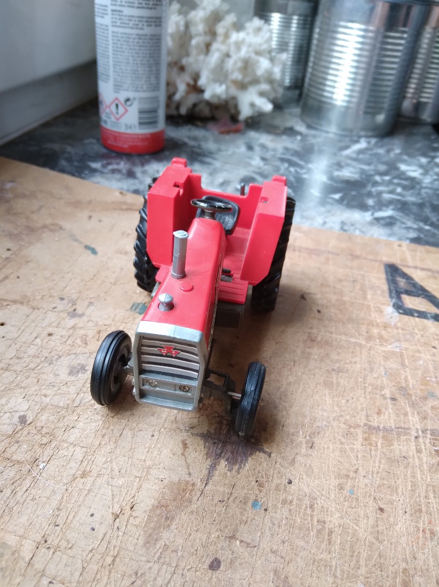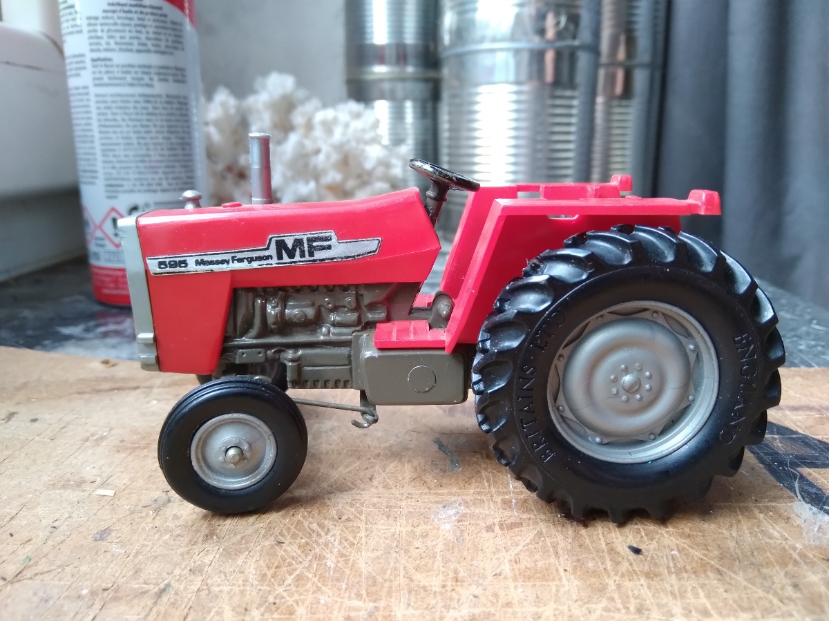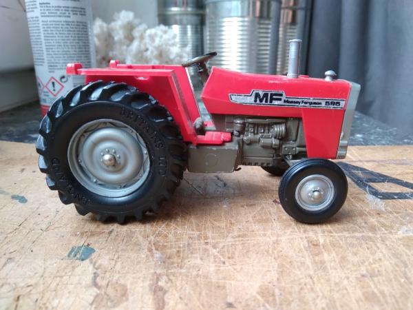 Tracteur MF 595 Britains. Manque la cabine et le bout de l'échappement apparemment, sinon en bon état. Échelle 1:32.
