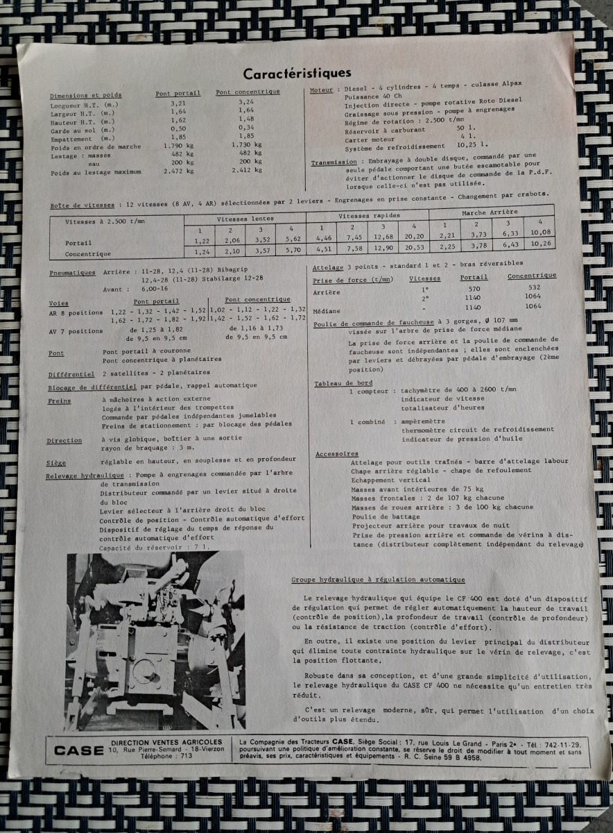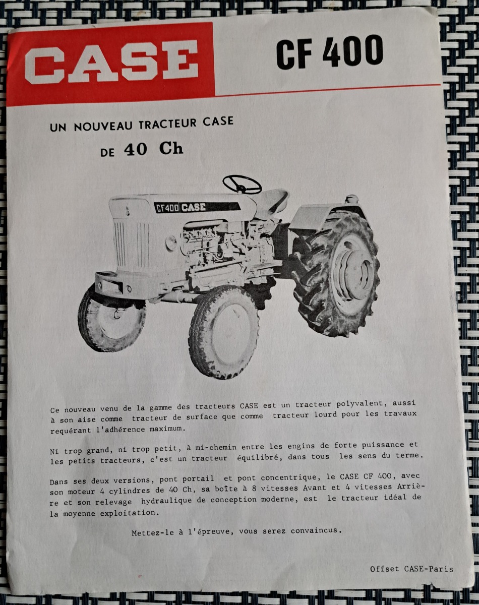 Prospectus tracteur CASE CF 400 une feuille recto verso bon état voir les photos.