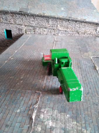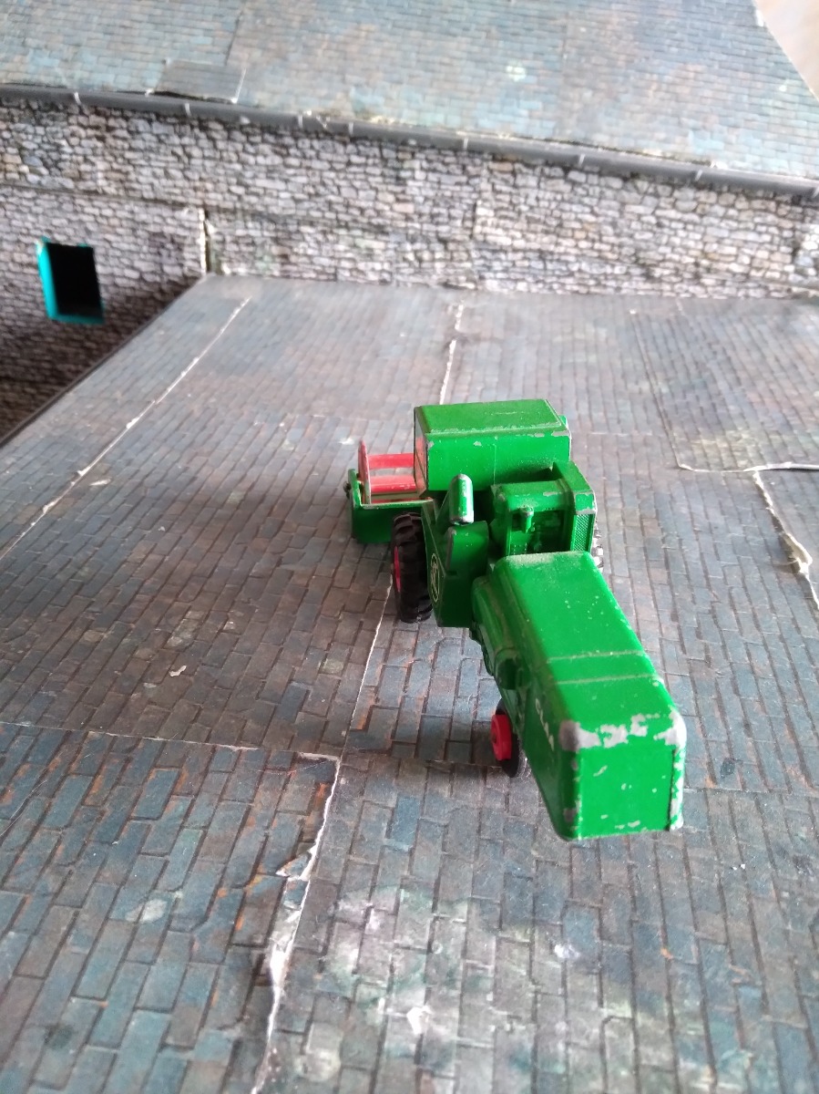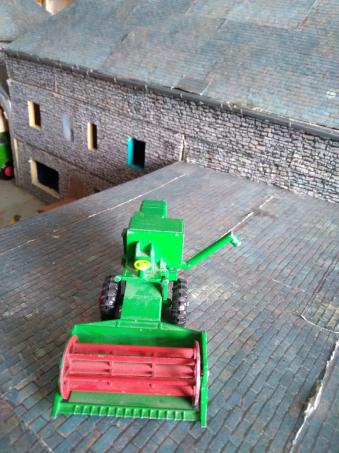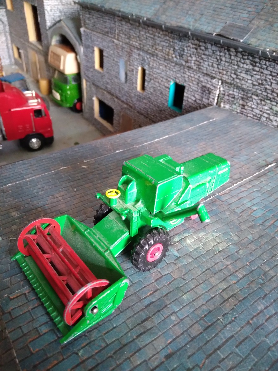 Très ancienne moissonneuse CLAAS Matchbox (1967), collection King Size, échelle 1:50 ? (je pense :4,2 cm de large au niveau des roues avant et 6cm pour la barre de coupe ). En bon état, vu son âge.