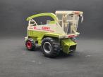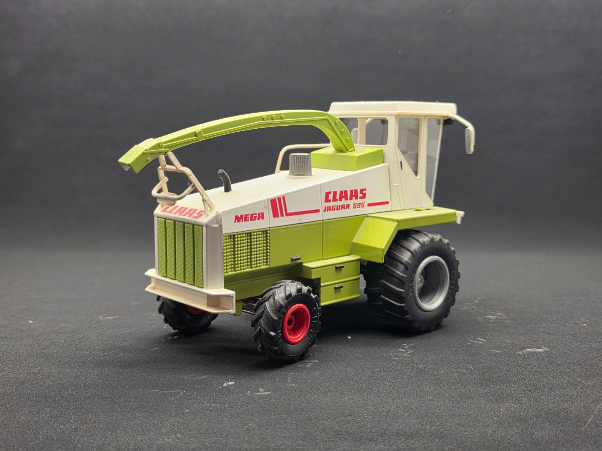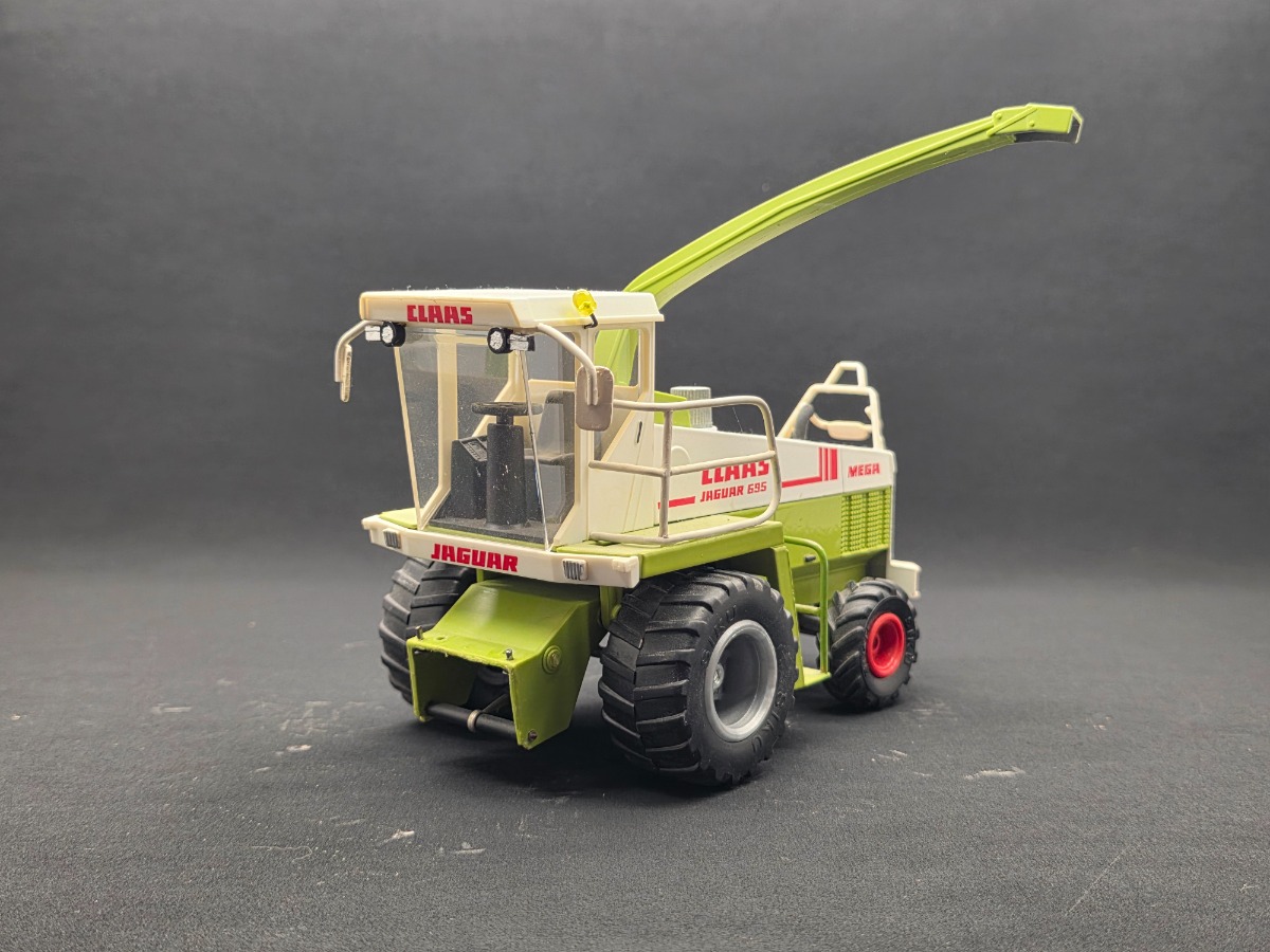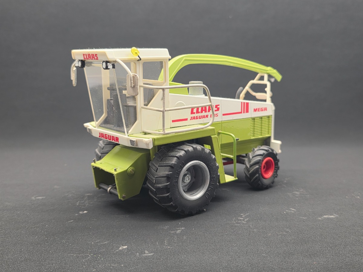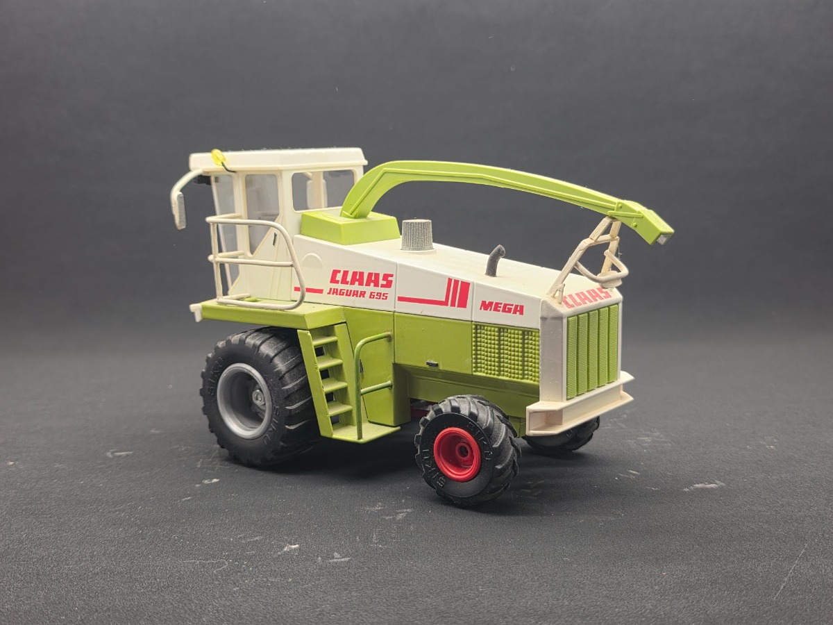 Ensileuse CLAAS Jaguar 695 Mega Siku "améliorée". Changement des roues avant, ajout de garde corps et de phares. Mise en place d'un pose buse et décrochage du bec. Réglage du bec à l'aide d'un vérin plutôt que des crochets.