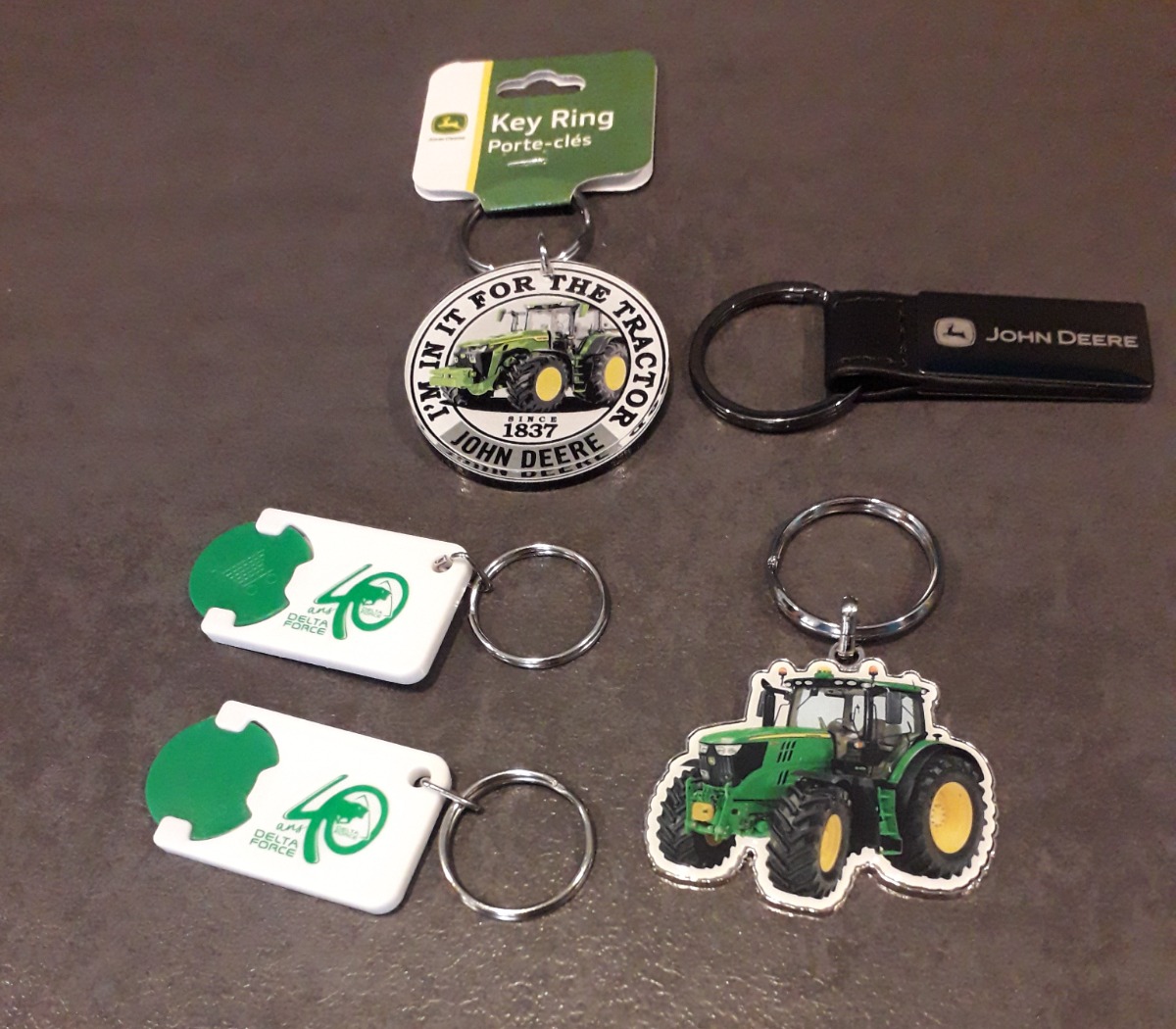 3 portes clefs JOHN DEERE neufs et 2 porte jetons pour caddie.