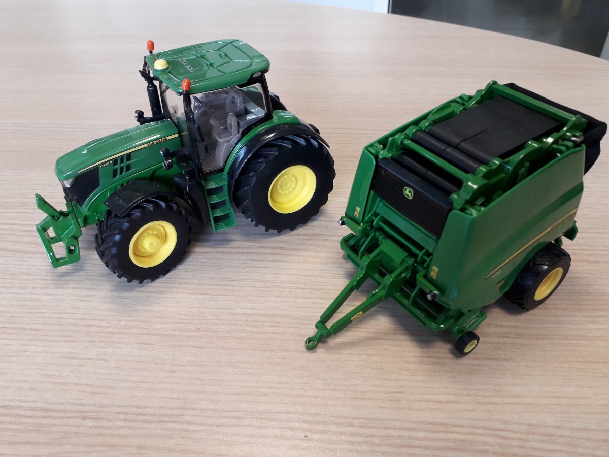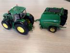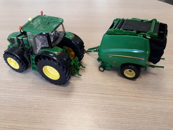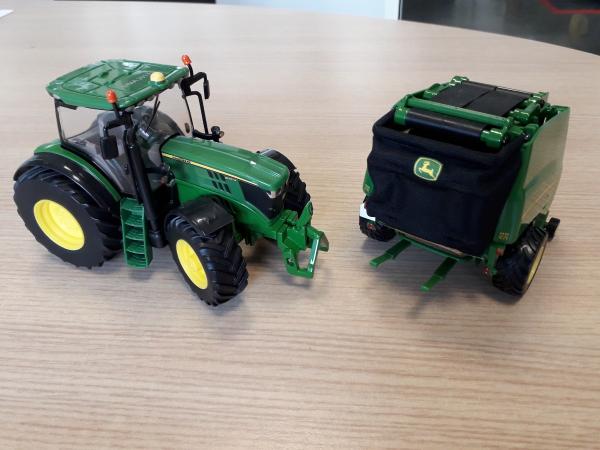 Tracteur JOHN DEERE 6210R et sa presse 990 + une balle ronde de chez Britains.