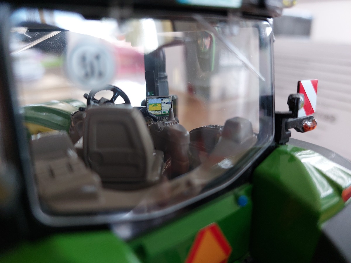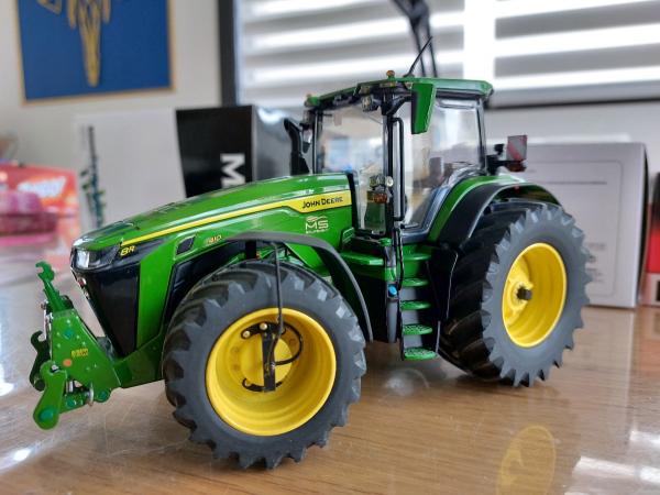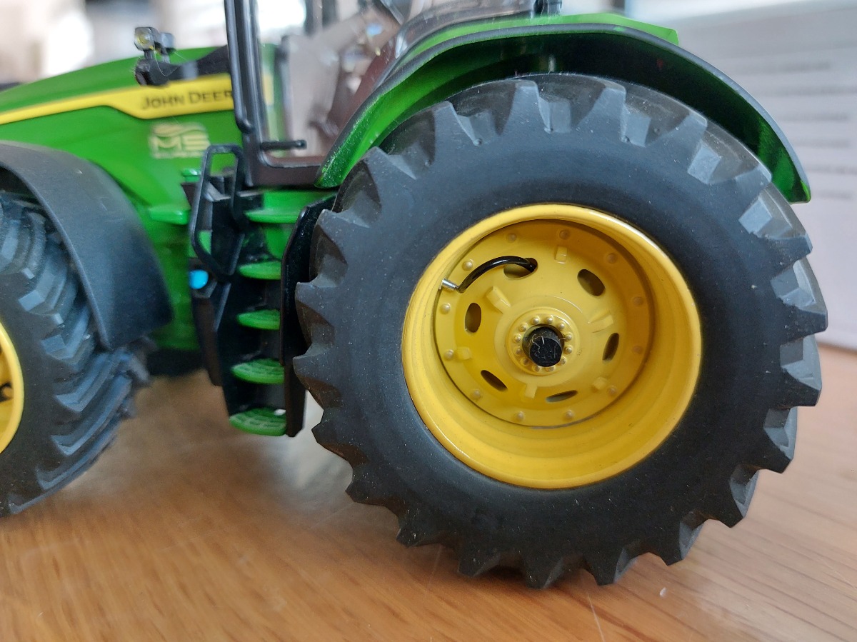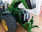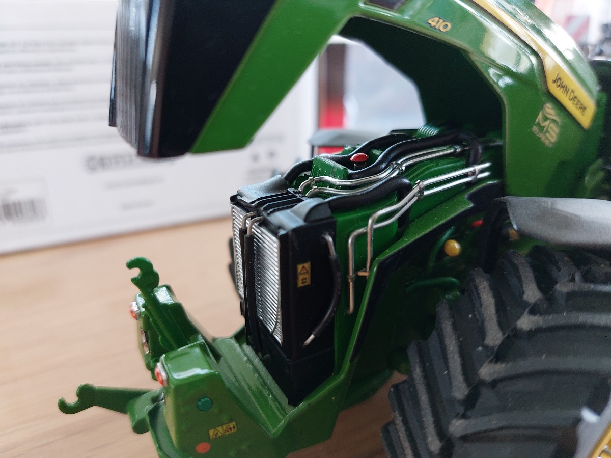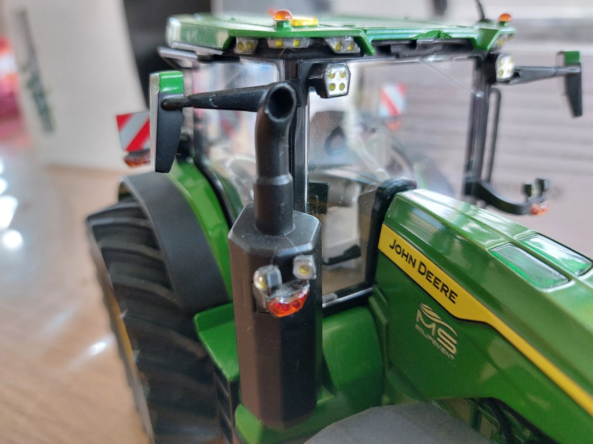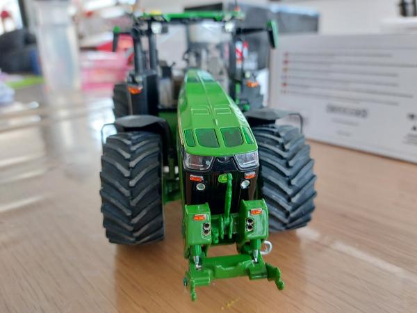 JOHN DEERE 8r 410 modifié par mes soins. Roues larges de chez UM, fabrication artisanale de telegonflage avant et arrière. Le tout est fonctionnel, les roues sont tournantes. Passage de tout les feux en Led cristal fait à l'aide de résine transparente dure. Rajout d'une antenne et de 4 flashers à l'avant. Pour finir gros travail au niveau du compartiment moteur avec fabrication de durites souples et conduits rigides. Matérialisation du démarreur, des filtres, je la jauge à huile et fabrication d'un alternateur. Ajout d'autocollants concession ms équipement. Modèle unique.