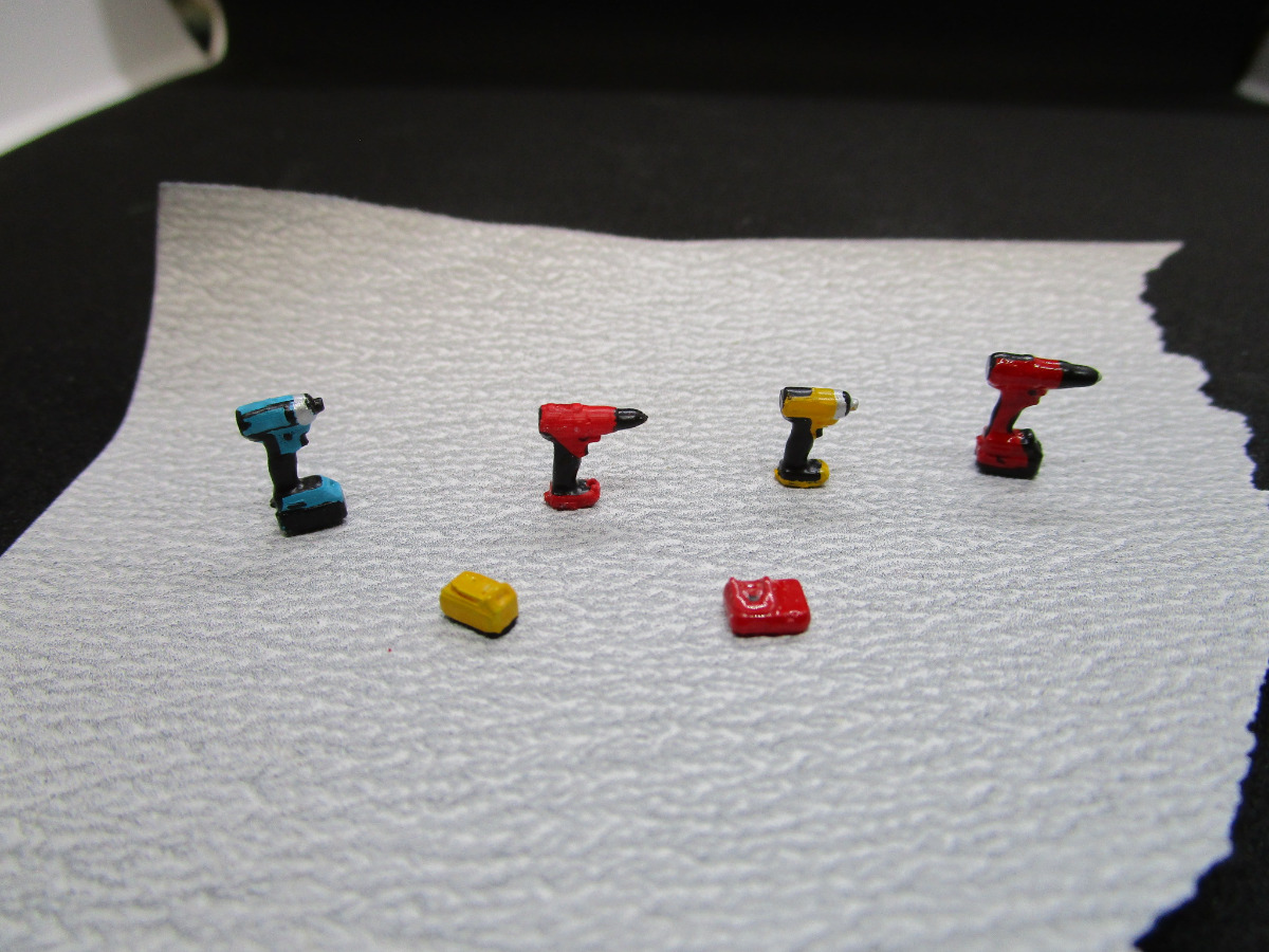 reproduction d'un lot de petits outillages électroportatif pour agrémenter un diorama d'atelier.