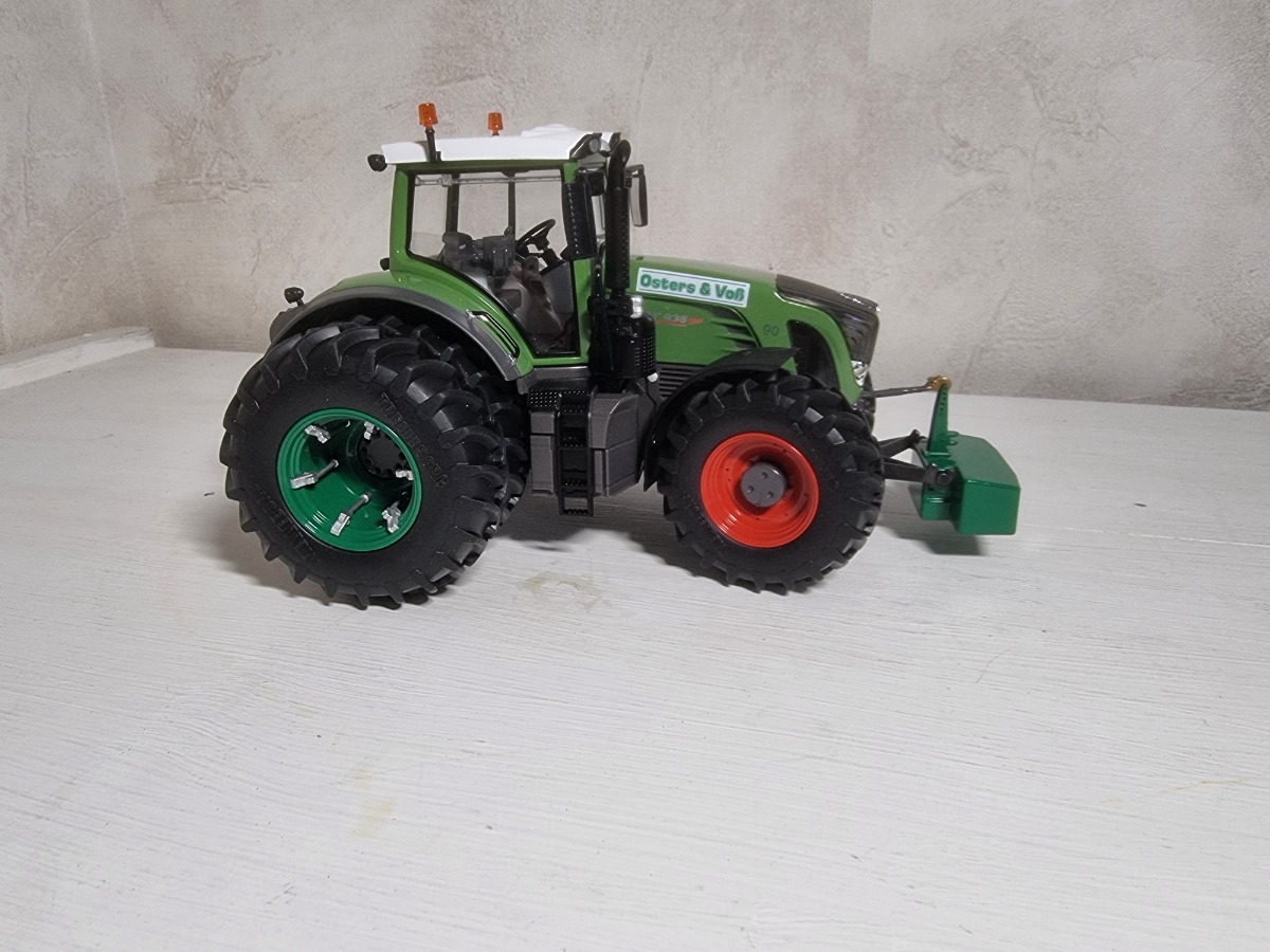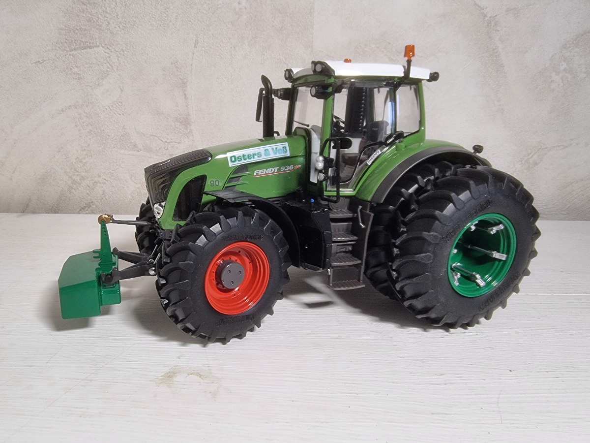 Tracteur FENDT 936 Vario TMS Osters & Vob avec jumelage arrière et masse vert caractéristique de l'entreprise.