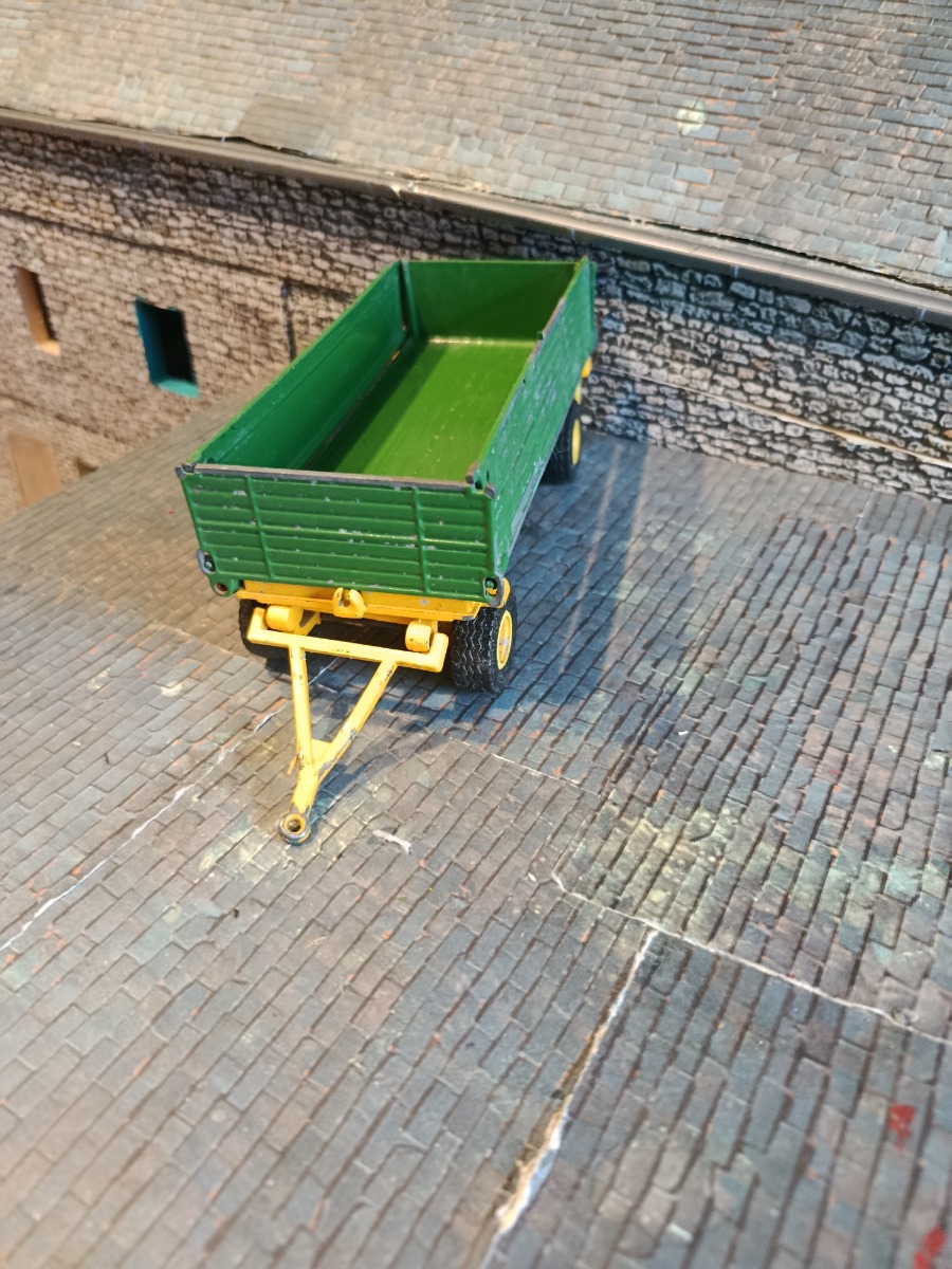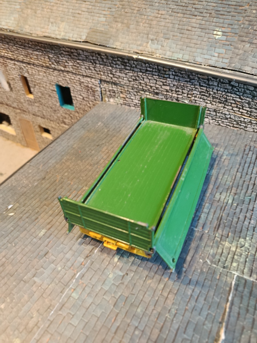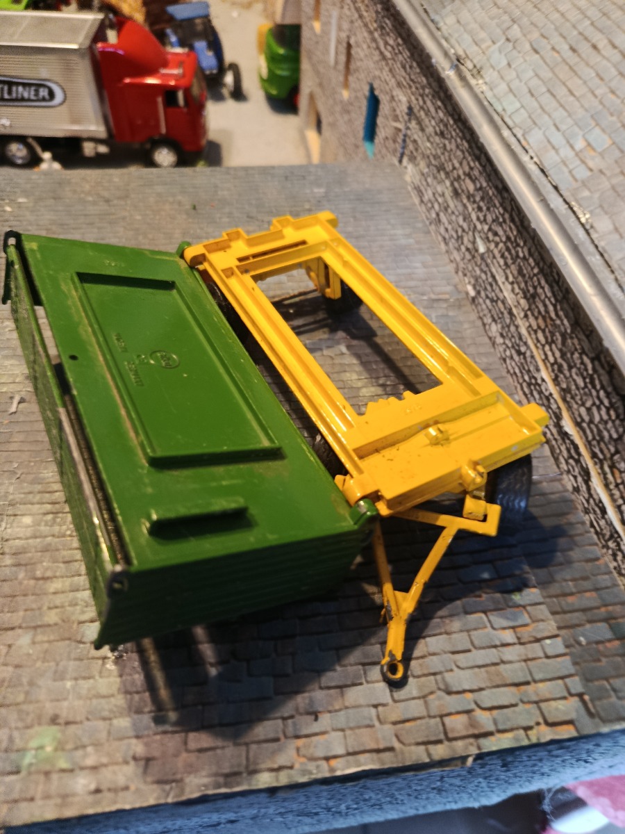 Remorque Siku à réparer : éclats de peinture, système de déversement latéral absent. Échelle 1:32.
