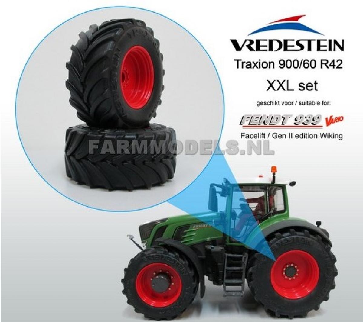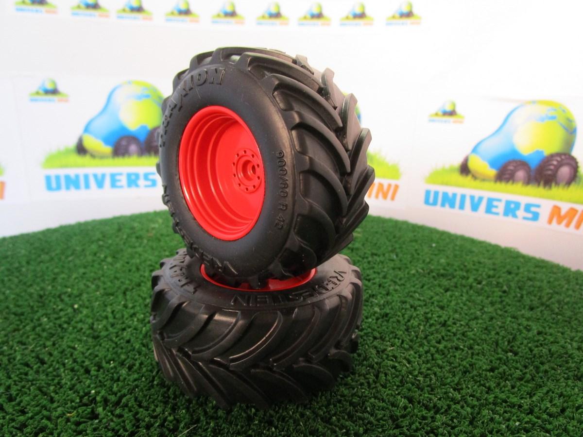 2 jantes aluminium rouge arrière+ pneus Vredestein Traxion 900/60 R42 pour tracteur FENDT 939 Wiking. Référence 7343. 68.2 x 31.4 mm.