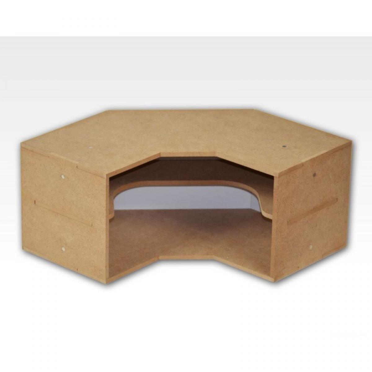 Module étagère d'angle. Le module d'étagères d'angle comporte deux étagères. Ce module modifie l'angle de 90 degrés du système d'atelier modulaire.