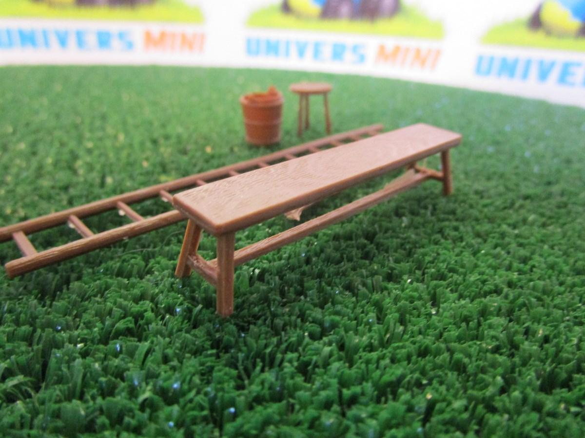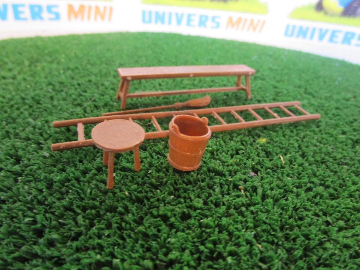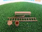 5 objets décoratifs pour ferme. 1 banc, 1 échelle, 1 balai, 1 sceau et 1 tabouret.