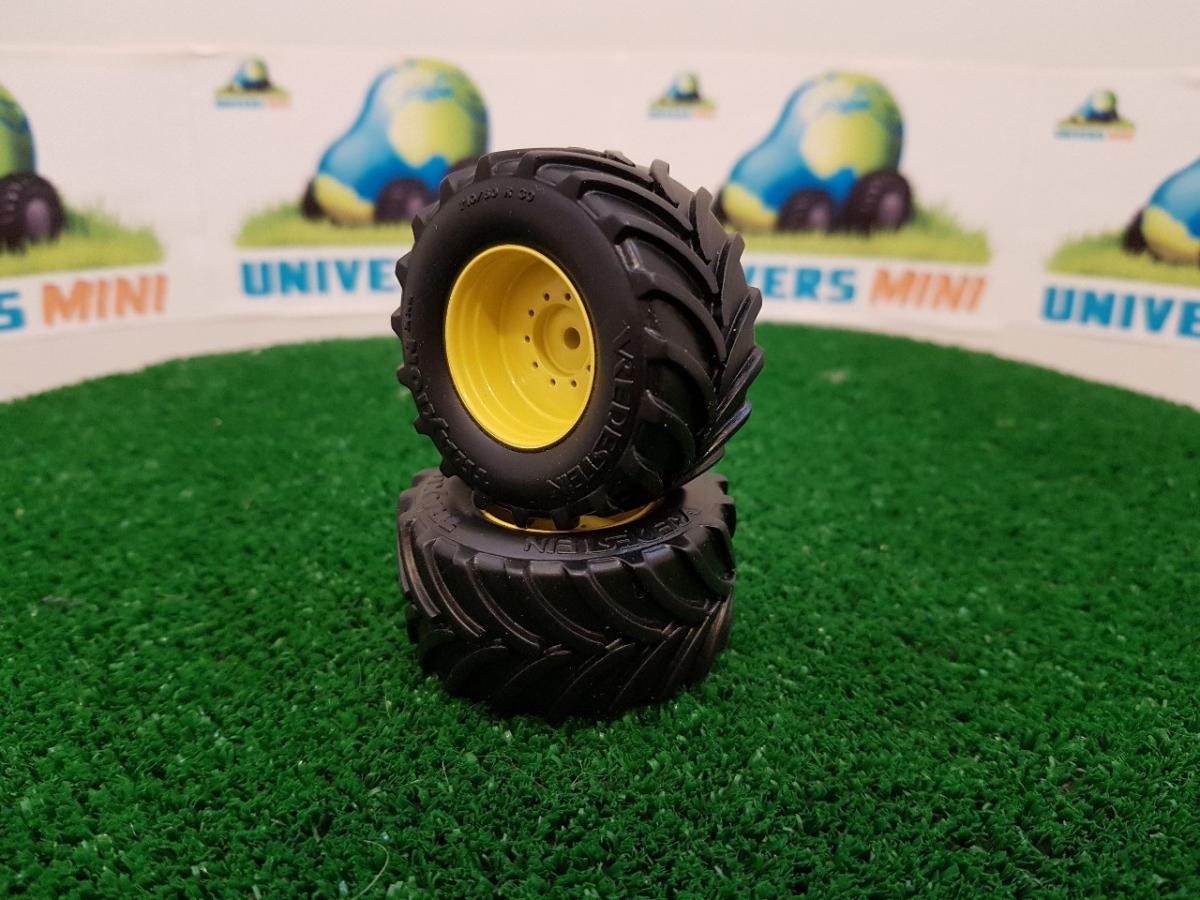 2 jantes aluminium arrière (jaune) + 2 pneus Vredestein pour ensileuse JOHN DEERE 8500i (Wiking 7832). Diamètre 51.5mm. Largeur 25.5mm. Utilisez les réducteurs référence 29050J pour finir l'ensemble.