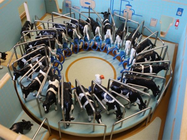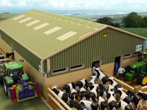 Salle de traite rotative pouvant accueillir 20 vaches. Livrée avec 50 barrières en métal, sac imitant le fumier (sciure bois marron) et cuve à lait. Nombreux détails. Longueur 710mm Largeur 420mm Hauteur 210mm. Compatible avec le batiment d'élevage (BT8600). Animaux et matériels agricoles vendus séparément.