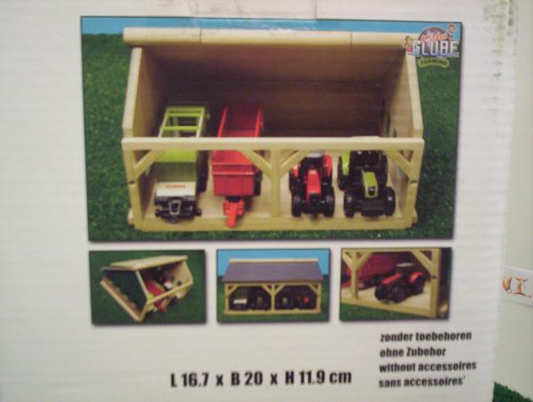 Hangar pour matériels, le tout en bois. Longueur 200mm Largeur 167mm Hauteur 119mm. Accessoires et matériels agricoles vendus séparément.