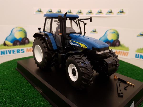 Tracteur NEW HOLLAND TM155 avec jumelage arrière. Le jumelage arrière est démontable. Livré avec relevage avant et masse avant interchangeable. Edition limitée à 2000 exemplaires.