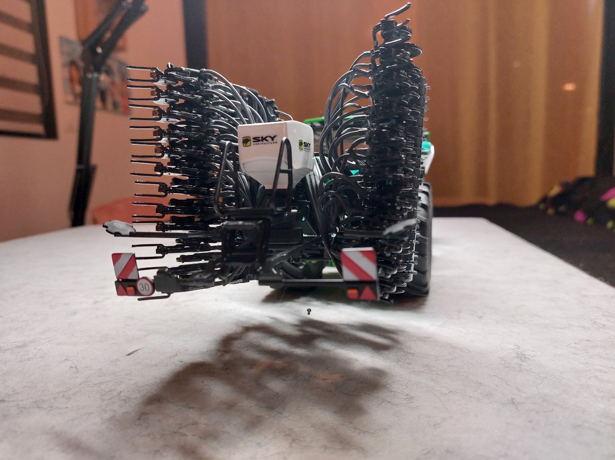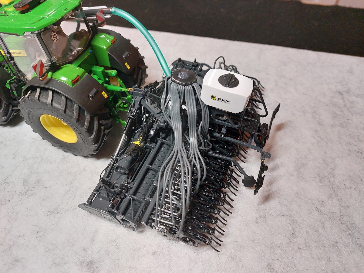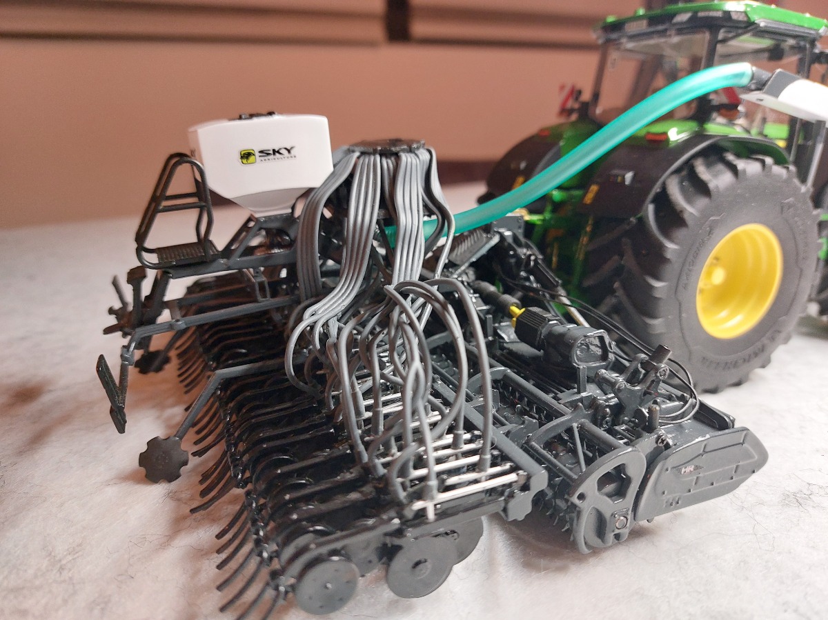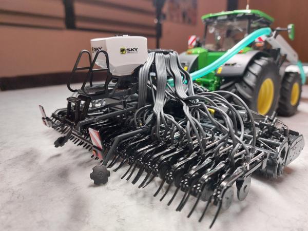 Ensemble de semis Sky réalisé à partir de la trémie Kuhn tf 1512 repeinte aux couleurs Sky. Ensuite la herse Kuhn HR 6040 a été entièrement démontée puis repeinte aux couleurs Sky également. J'y ai apposé un autocollant Sulky et un autocollant Cultiline HR 600-28. La barre de semis a été réalisée à partir du semoir Bednar Omega 6000. Ce semoir a été mis en pièces afin de récupérer les pièces nécessaires. La barre de semis du Bednar étant en 3 parties, je les ai redecoupées afin de n'en faire 2 parties. Peinture de l'ensemble aux couleurs Sky. J'ai également récupéré la trémie Alfa que j'ai repeinte en blanc. Application sur la trémie Alfa et la frontale d'autocollants Sky. Pour terminer l'ensemble, j'ai fabriqué un tuyau de transfert sur mesure. Le carénage est zn aluminium de même que le tube. Le support est réalisé à l'aide de rond plein en styrene que j'ai cintré. Tout le support est entièrement démontable car le support est vissé sur le tracteur, les poteaux sont vissés sur le support et le carénage et le tube est vissé sur le carénage. Voilà, de nombreuses heures ont été nécessaires pour réaliser le tout.
