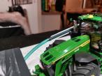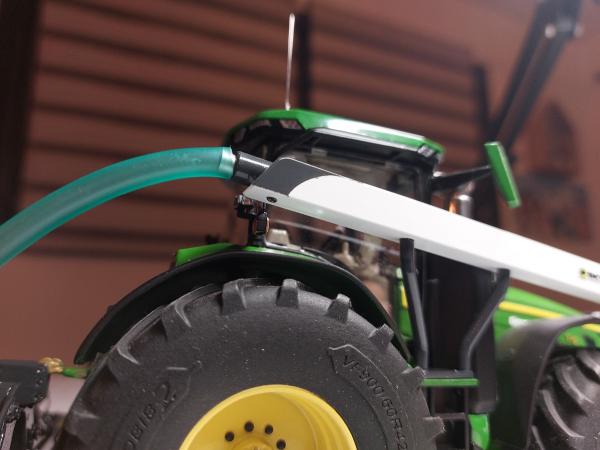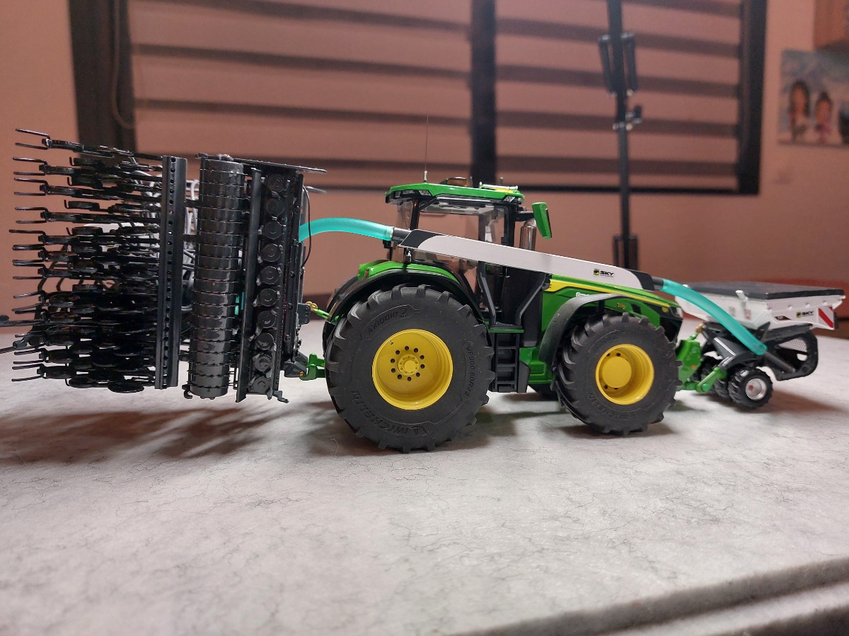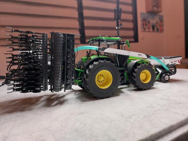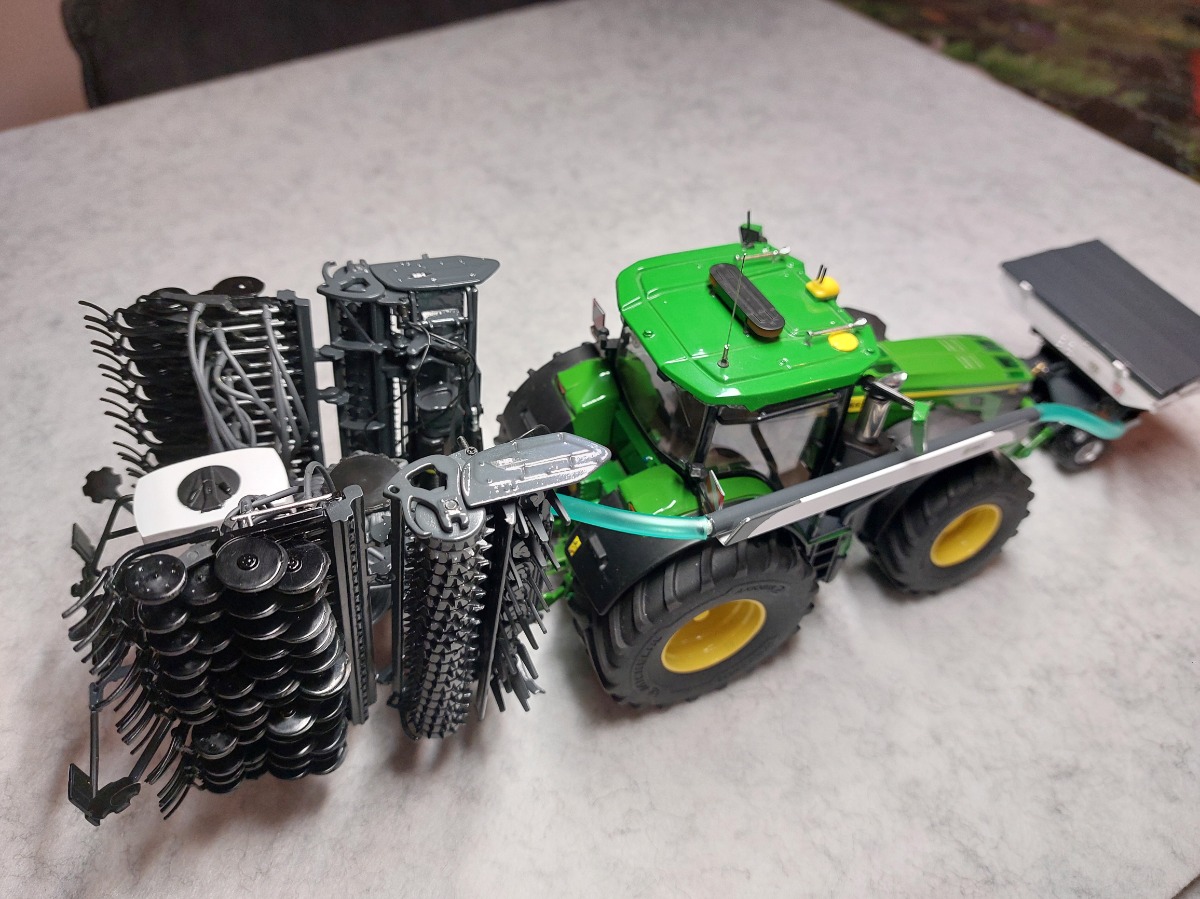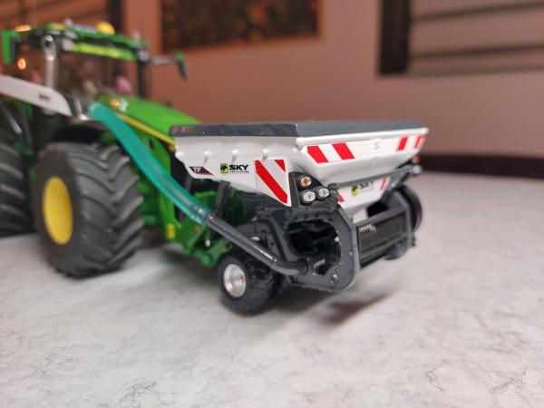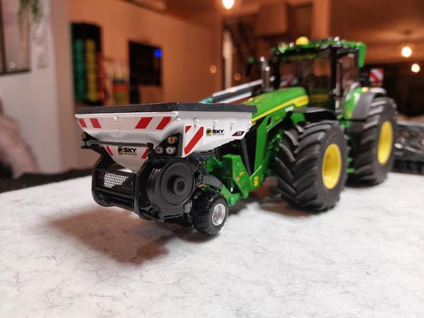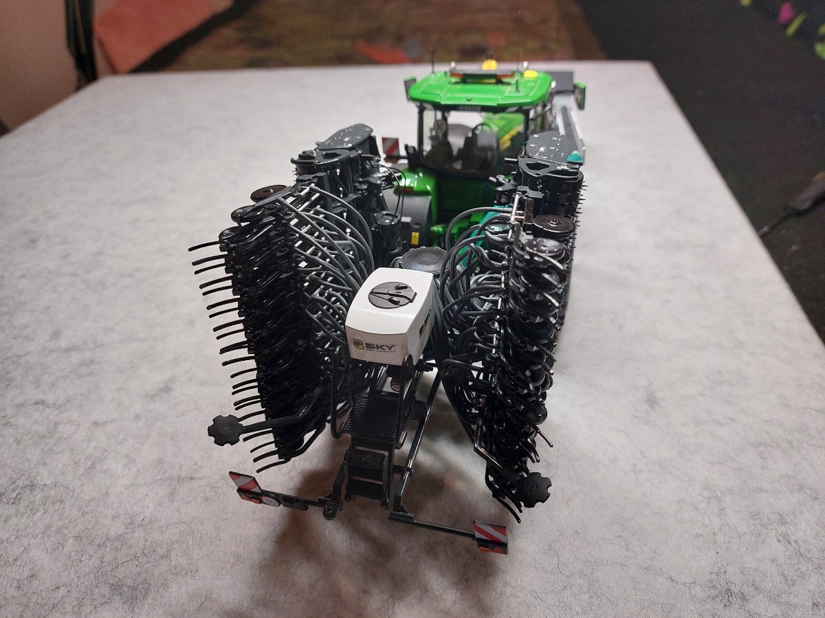Ensemble de semis Sky réalisé à partir de la trémie Kuhn tf 1512 repeinte aux couleurs Sky. Ensuite la herse Kuhn HR 6040 a été entièrement démontée puis repeinte aux couleurs Sky également. J'y ai apposé un autocollant Sulky et un autocollant Cultiline HR 600-28. La barre de semis a été réalisée à partir du semoir Bednar Omega 6000. Ce semoir a été mis en pièces afin de récupérer les pièces nécessaires. La barre de semis du Bednar étant en 3 parties, je les ai redecoupées afin de n'en faire 2 parties. Peinture de l'ensemble aux couleurs Sky. J'ai également récupéré la trémie Alfa que j'ai repeinte en blanc. Application sur la trémie Alfa et la frontale d'autocollants Sky. Pour terminer l'ensemble, j'ai fabriqué un tuyau de transfert sur mesure. Le carénage est zn aluminium de même que le tube. Le support est réalisé à l'aide de rond plein en styrene que j'ai cintré. Tout le support est entièrement démontable car le support est vissé sur le tracteur, les poteaux sont vissés sur le support et le carénage et le tube est vissé sur le carénage. Voilà, de nombreuses heures ont été nécessaires pour réaliser le tout.
