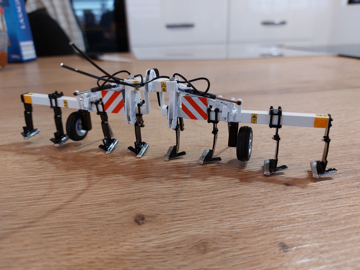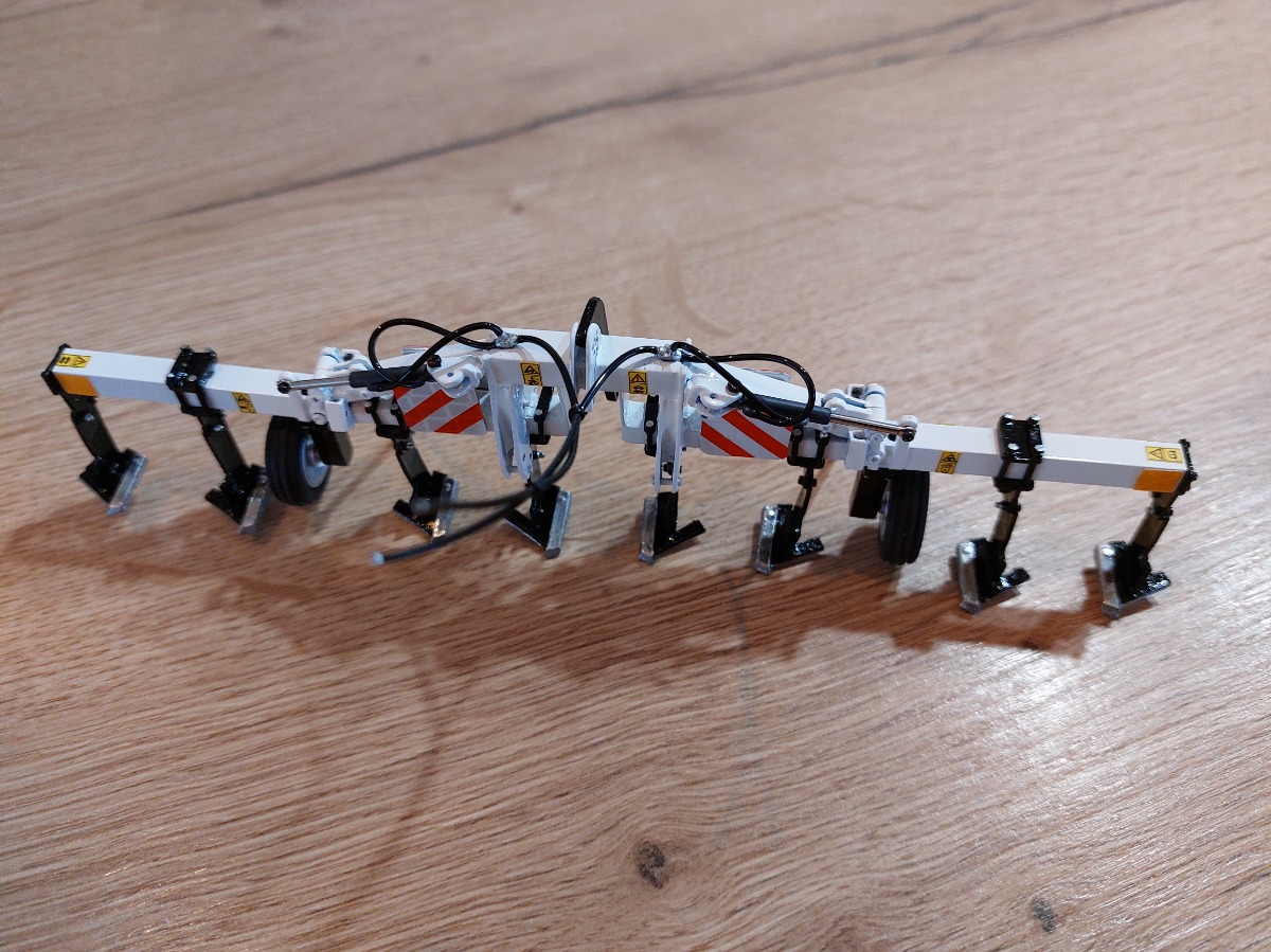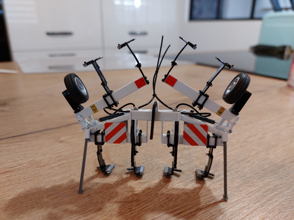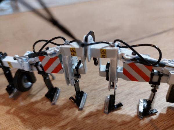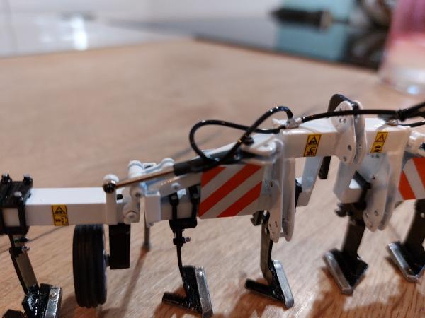 Décompacteur en 6m. Je suis parti d'un combiplow 4m, je l'ai raccourci pour le mettre en 3 m puis j'ai rajouté 2 tubes carré. J'ai ensuite utilisé des pièces détachées pour les vérins et tout le système de bascule. Tout est vissé et non collé. Ensuite peinture blanche brillante, de tous les rivets en chrome ainsi que les dents de socles. Fabrication des panneaux de gabarit avec des plaques d'alu découpées et utilisation de bandes réfléchissantes découpées puis placées les unes contre les autres. Ajout de pictogrammes danger ainsi que les flexibles de vérins. Pour finir, utilisation de roues de brouette playmobile pour les roues de jauge.