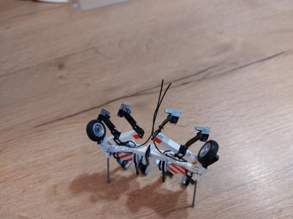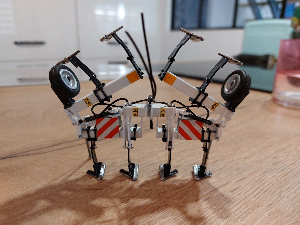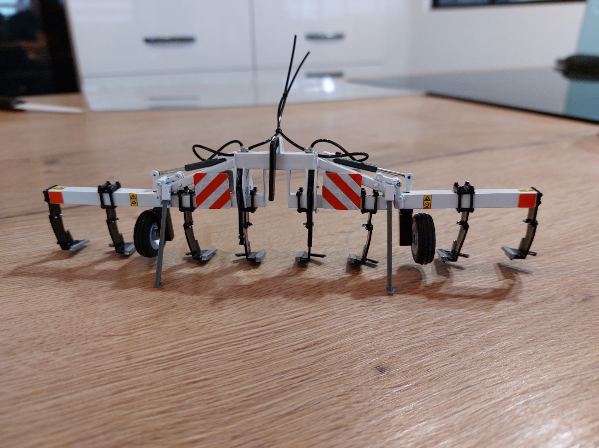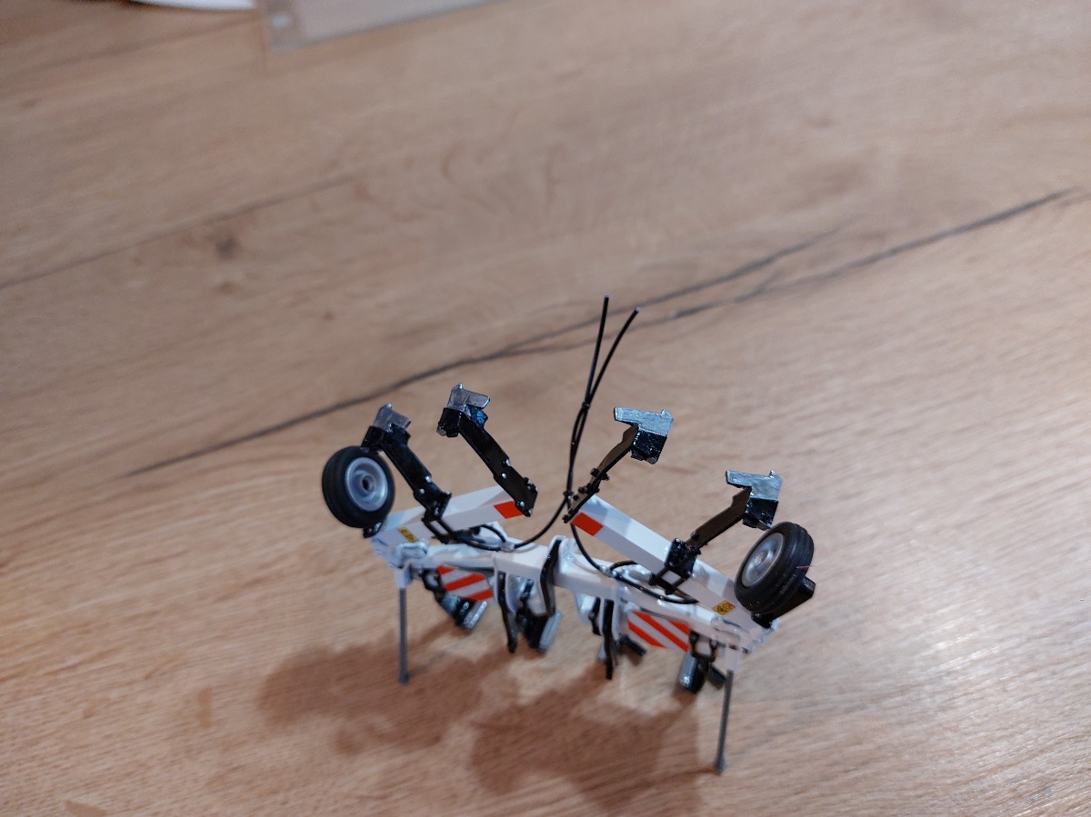 Décompacteur en 6m. Je suis parti d'un combiplow 4m, je l'ai raccourci pour le mettre en 3 m puis j'ai rajouté 2 tubes carré. J'ai ensuite utilisé des pièces détachées pour les vérins et tout le système de bascule. Tout est vissé et non collé. Ensuite peinture blanche brillante, de tous les rivets en chrome ainsi que les dents de socles. Fabrication des panneaux de gabarit avec des plaques d'alu découpées et utilisation de bandes réfléchissantes découpées puis placées les unes contre les autres. Ajout de pictogrammes danger ainsi que les flexibles de vérins. Pour finir, utilisation de roues de brouette playmobile pour les roues de jauge.