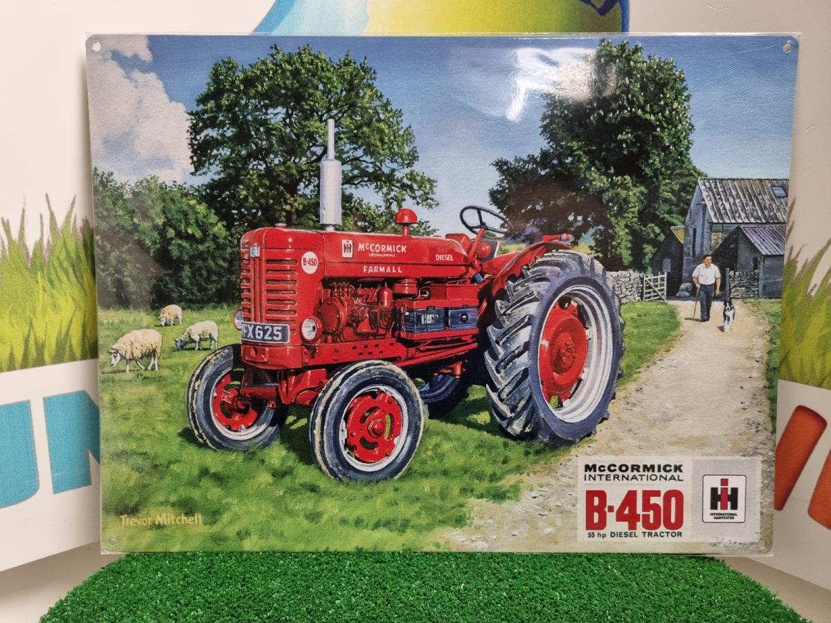 Plaque métal Farmall B450. 40 x 30cm. Percée aux 4 coins. Plaque en relief.