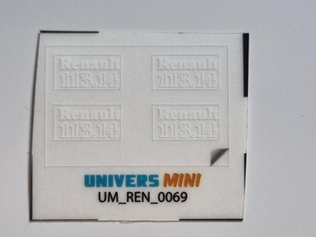4 autocollants capot RENAULT 113.14 blanc. 4x9mm. Pré-coupés, décollez et collez comme un autocollant classique ou utilisez la méthode décalque.