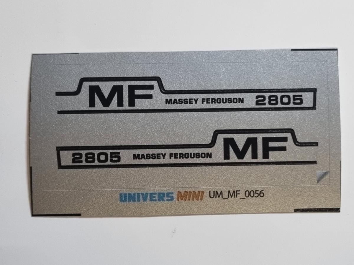 2 autocollants capot MASSEY FERGUSON 2805. Longueur 52mm. Pré-coupés, décollez et collez comme un autocollant classique ou utilisez la méthode décalque.