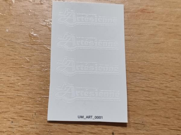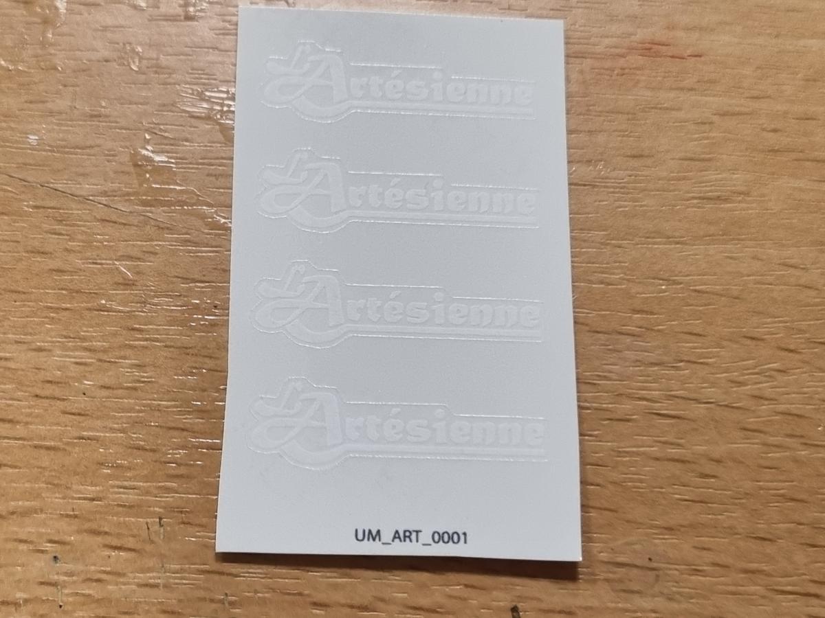4 autocollants logo l'ARTESIENNE blanc pré-coupé. 34mm x 10mm. Pré-coupés, décollez et collez comme un autocollant classique ou utilisez la méthode décalque.
