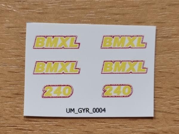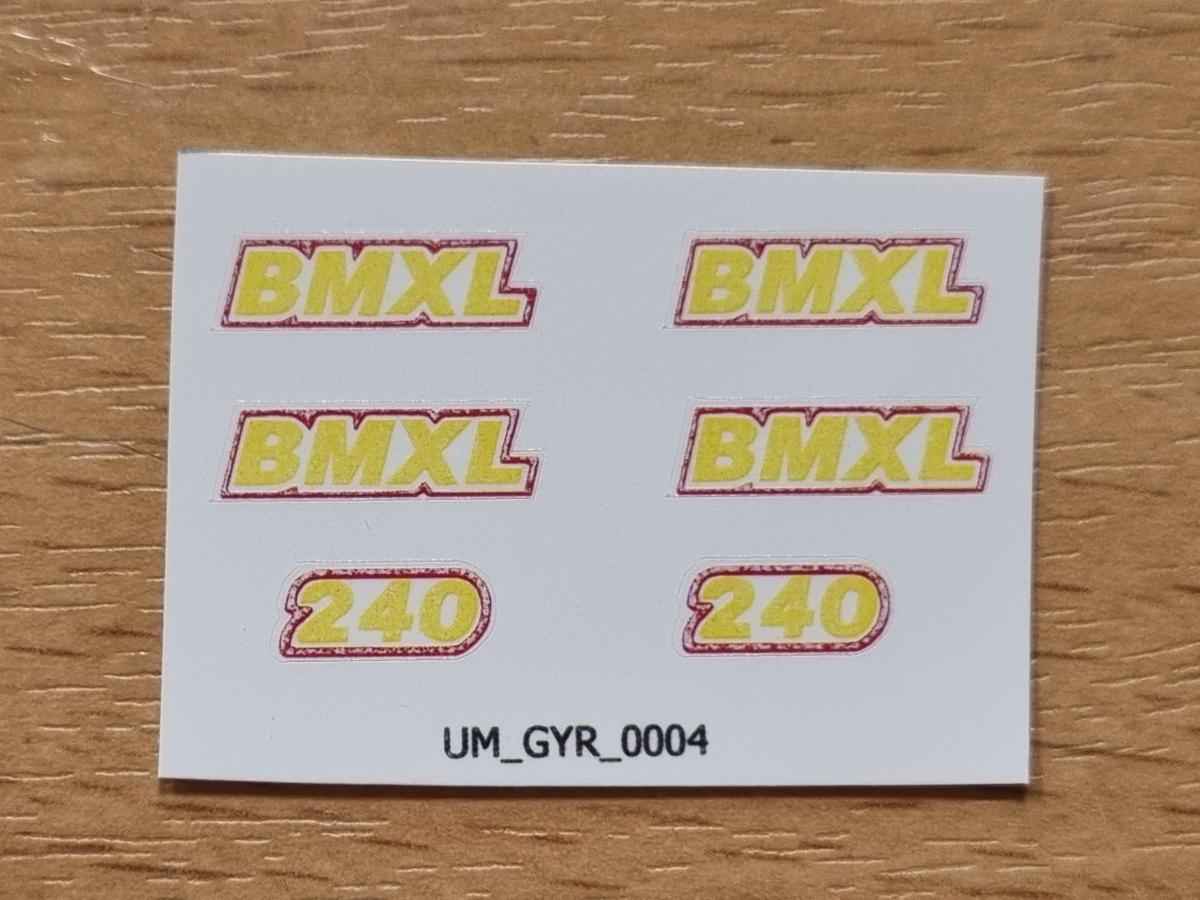 6 décalques GYRAX BMXL 240 pré-coupé. 4 décalques BMXL 4.5x16.7mm et 2 décalques 240 4.5x11mm. Fond transparent. Faites tremper le motif dont vous avez besoin 10/15 secondes dans de l'eau puis décoller le motif pré-coupé. Comment poser les décalques.