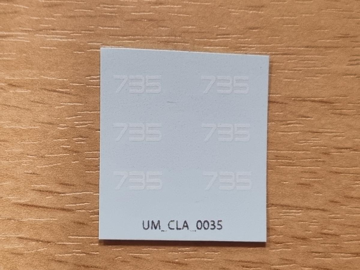 6 décalques CLAAS Challenger 735 blanc. 3x8mm. Fond transparent. Décalque à l'eau. Couper au plus proche du motif et laissez tremper 10/15 secondes pour décoller le motif.