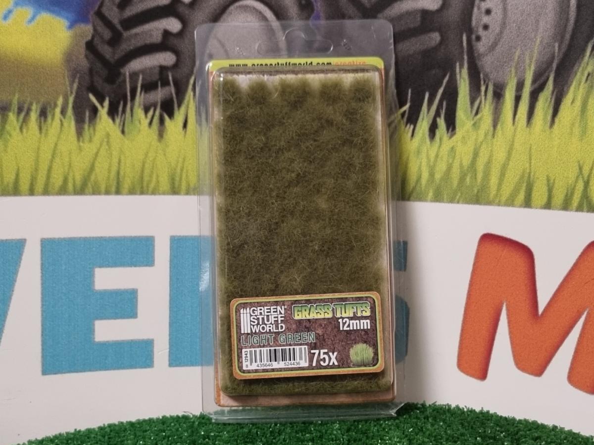 75 touffes herbes vert clair. Hauteur 12mm. Prêt à l'emploi en décollant simplement chaque touffe individuellement et en la plaçant dans votre scène.