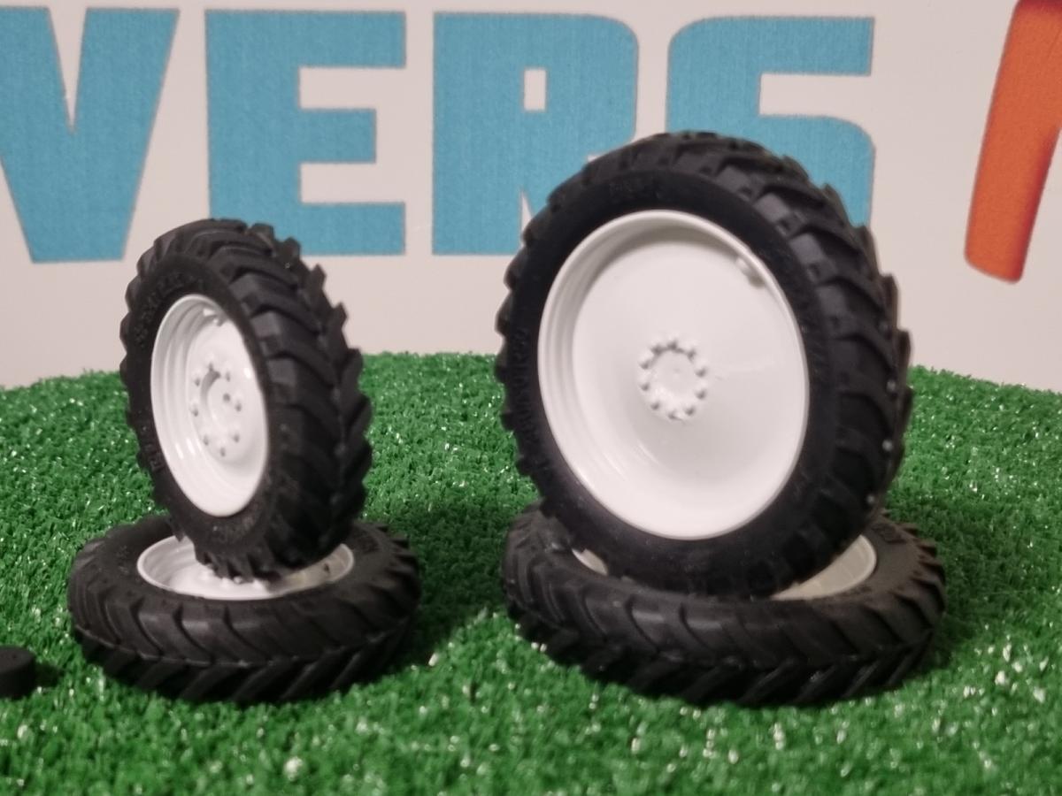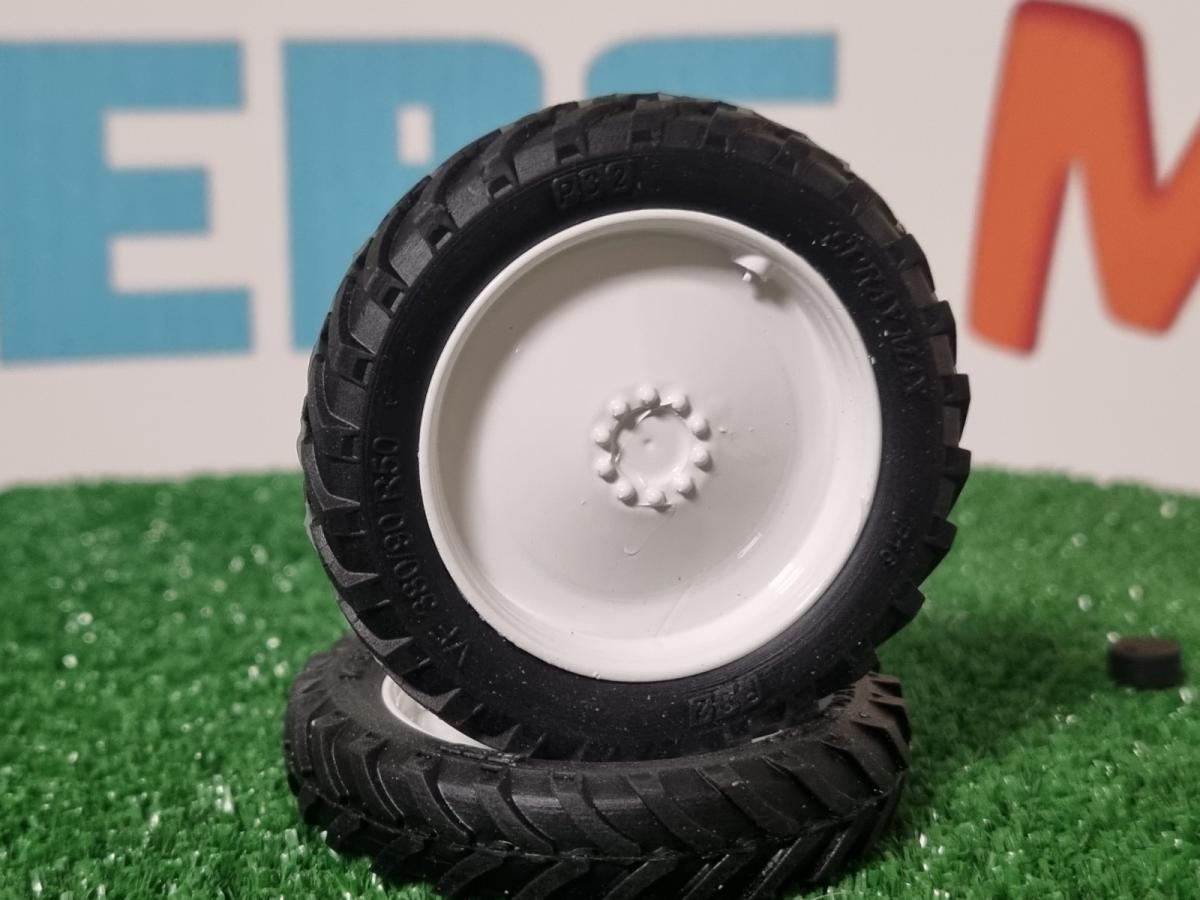 Roues étroites avant et arrière blanc. Pneus souple avec marquage sur les flans. Livrées avec moyeu pour les roues avant.